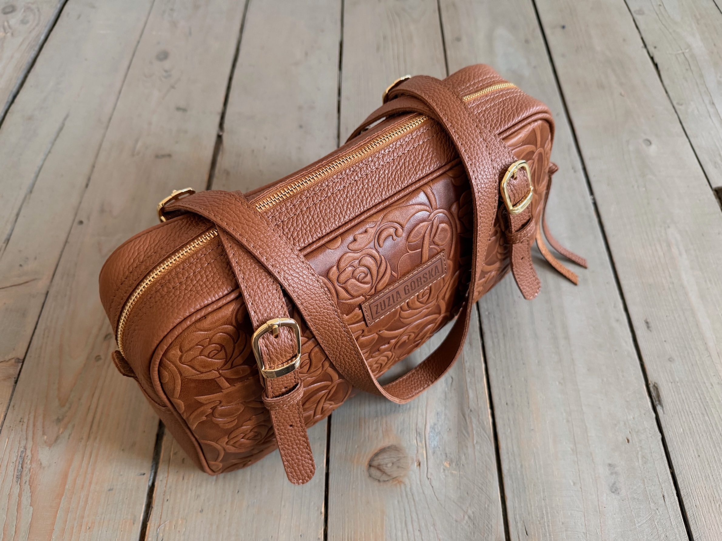Spora torba o jamnikowatym kształcie do noszenia na ramieniu. Uszyta ze skóry naturalnej licowej.