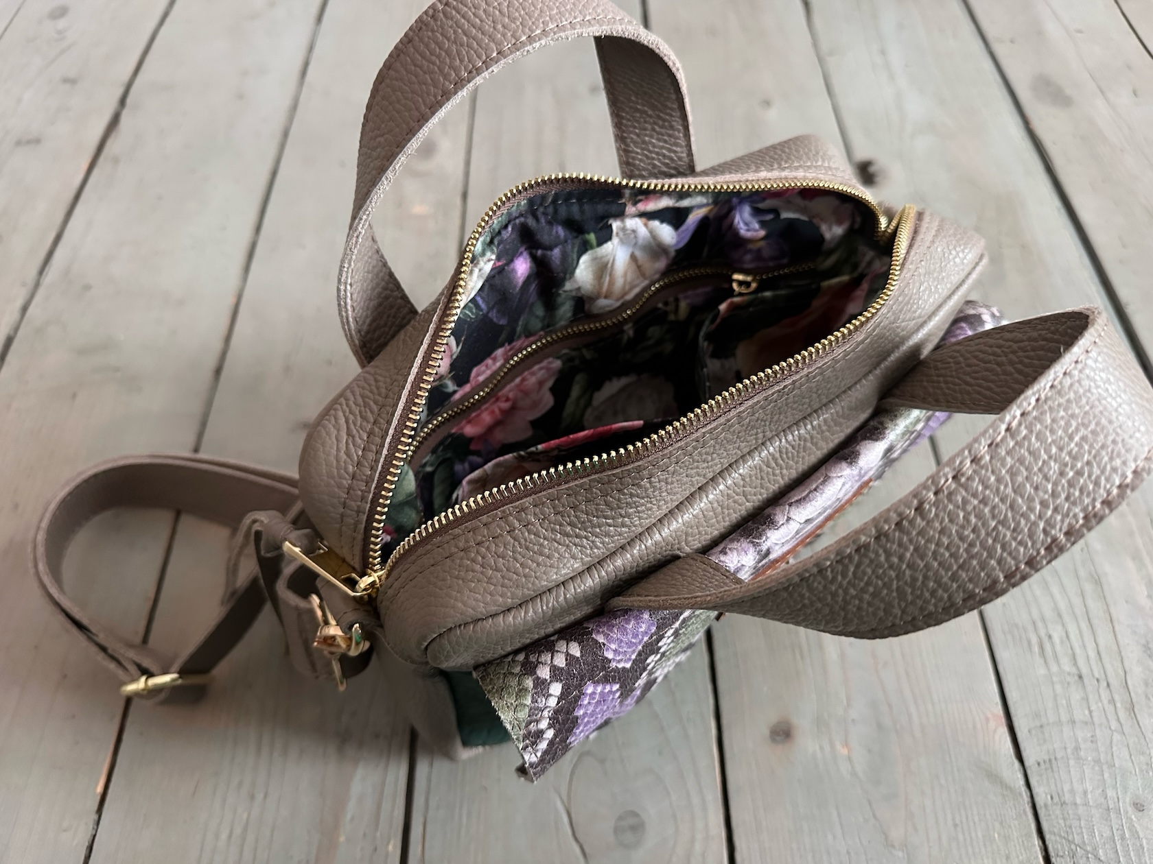 Wewnątrz kieszonka na zamek, 2x kieszonka wsuwka.