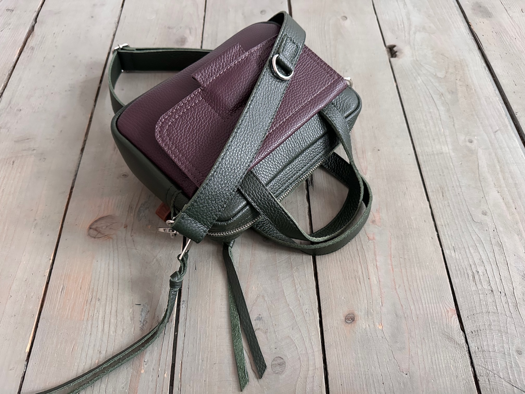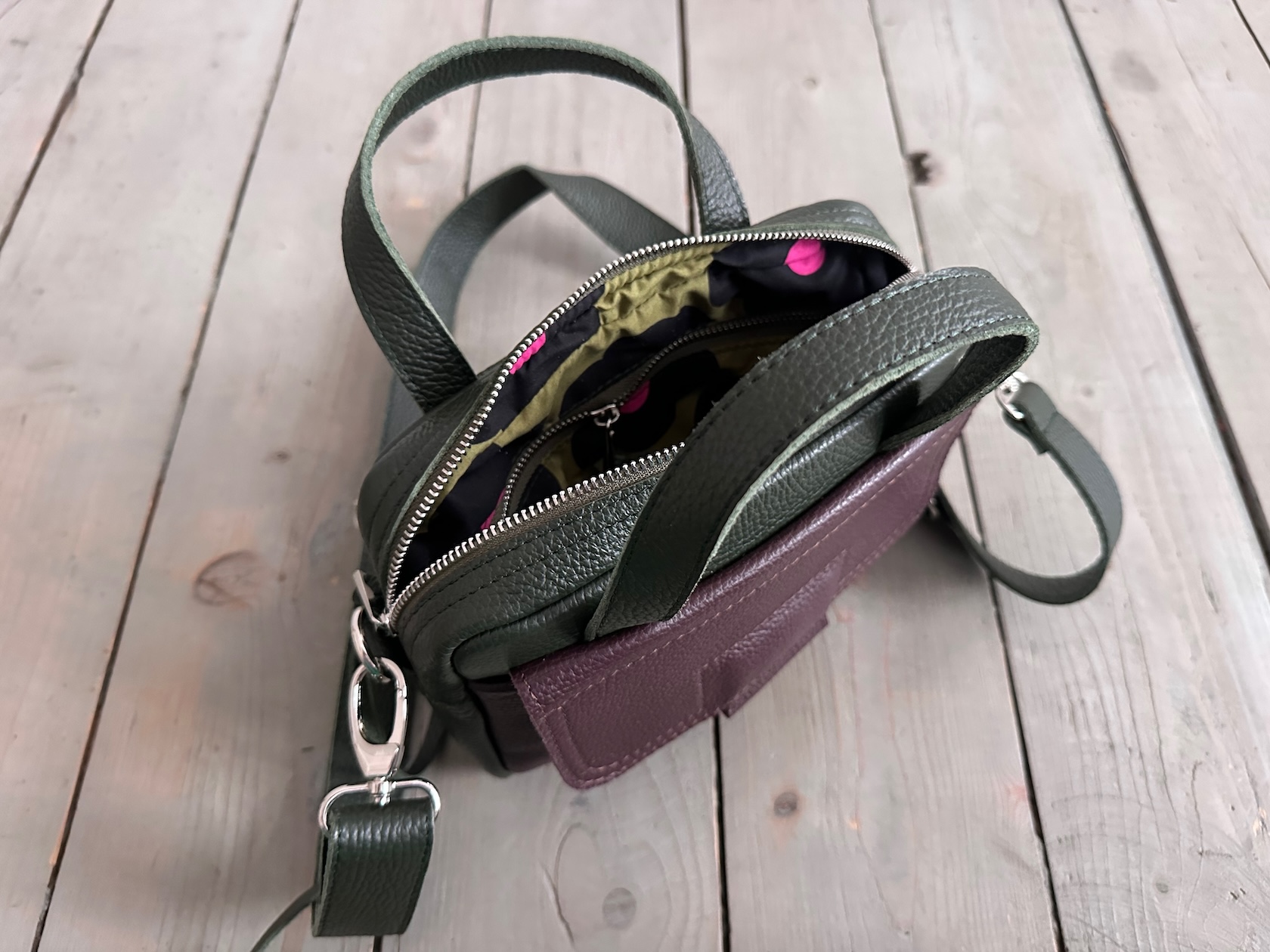 Zewnątrz naszyta kieszonka z klapką zamykana na magnes + kieszonka na zamek z tyłu.
