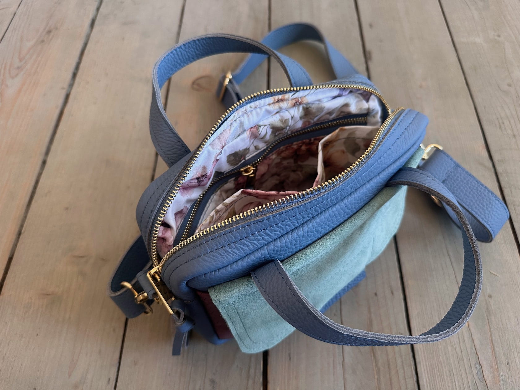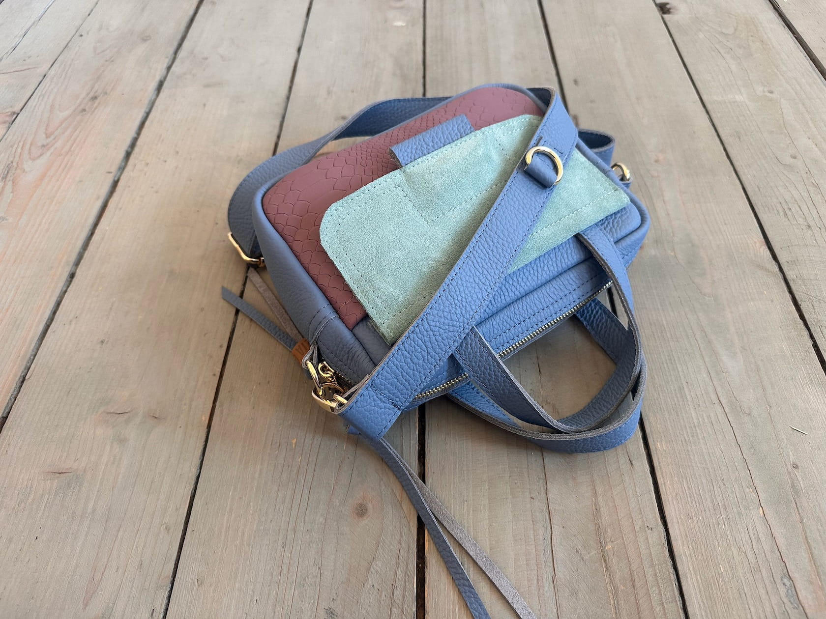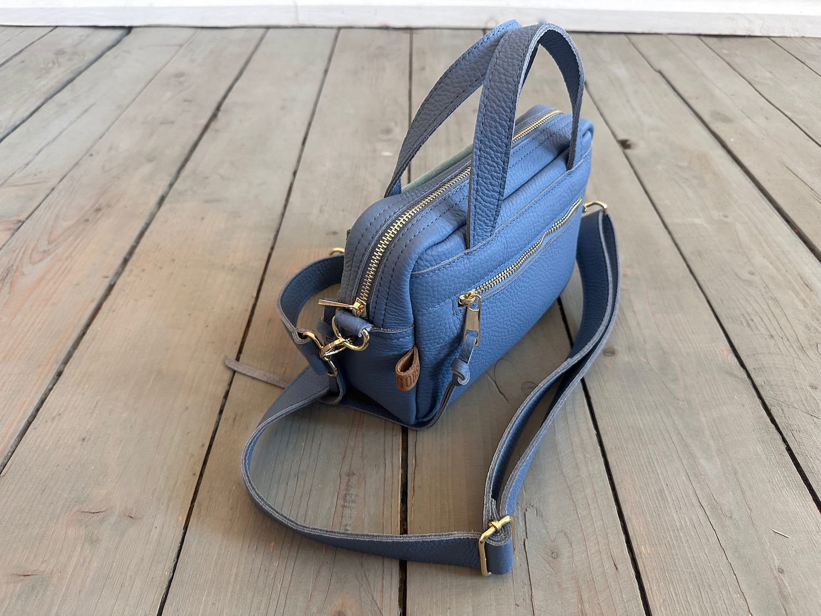 Uszyta ze skóry naturalnej licowej + welurowej.