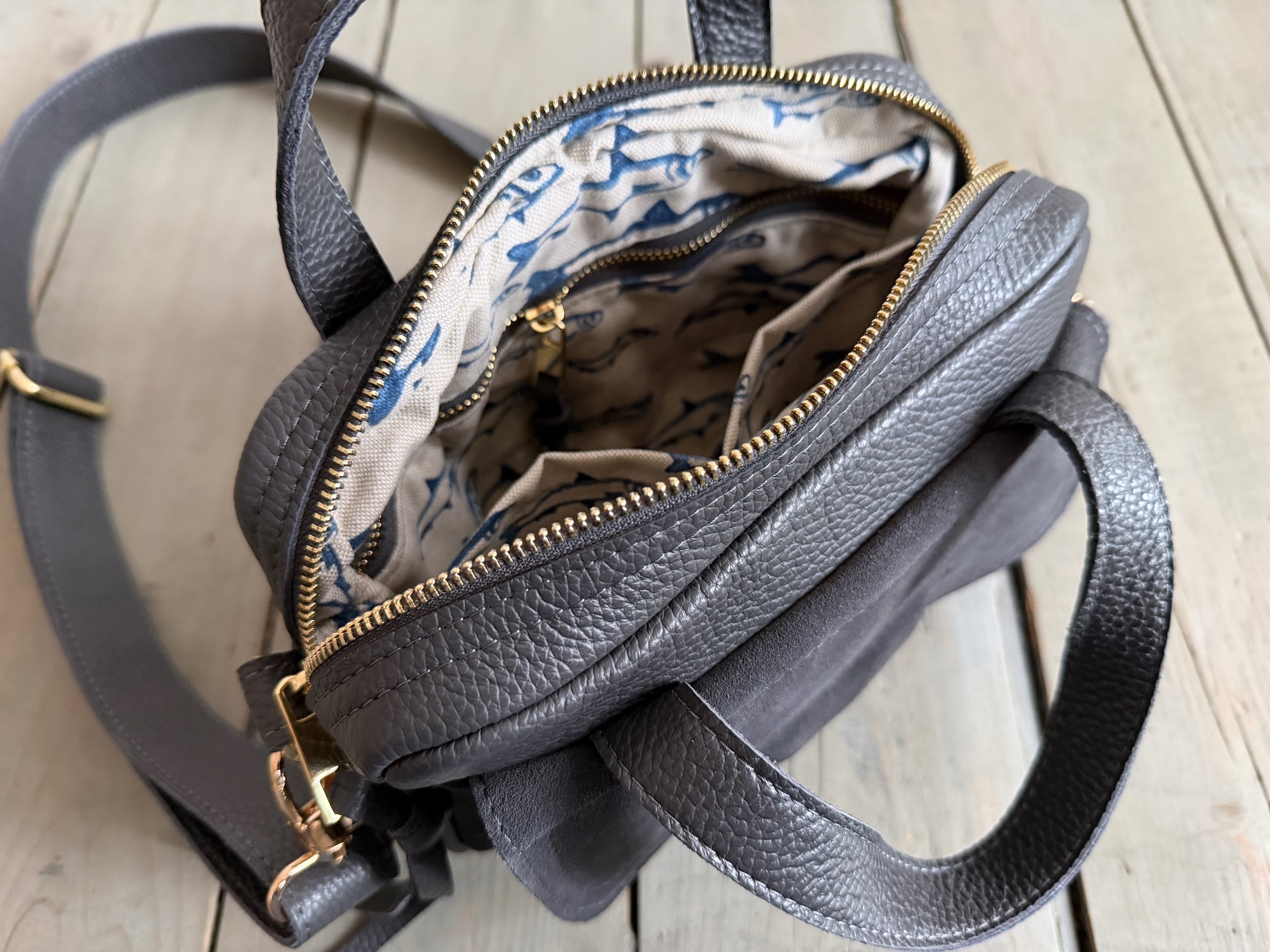 Wewnątrz kieszonka na zamek + dwie kieszonki wsuwki.