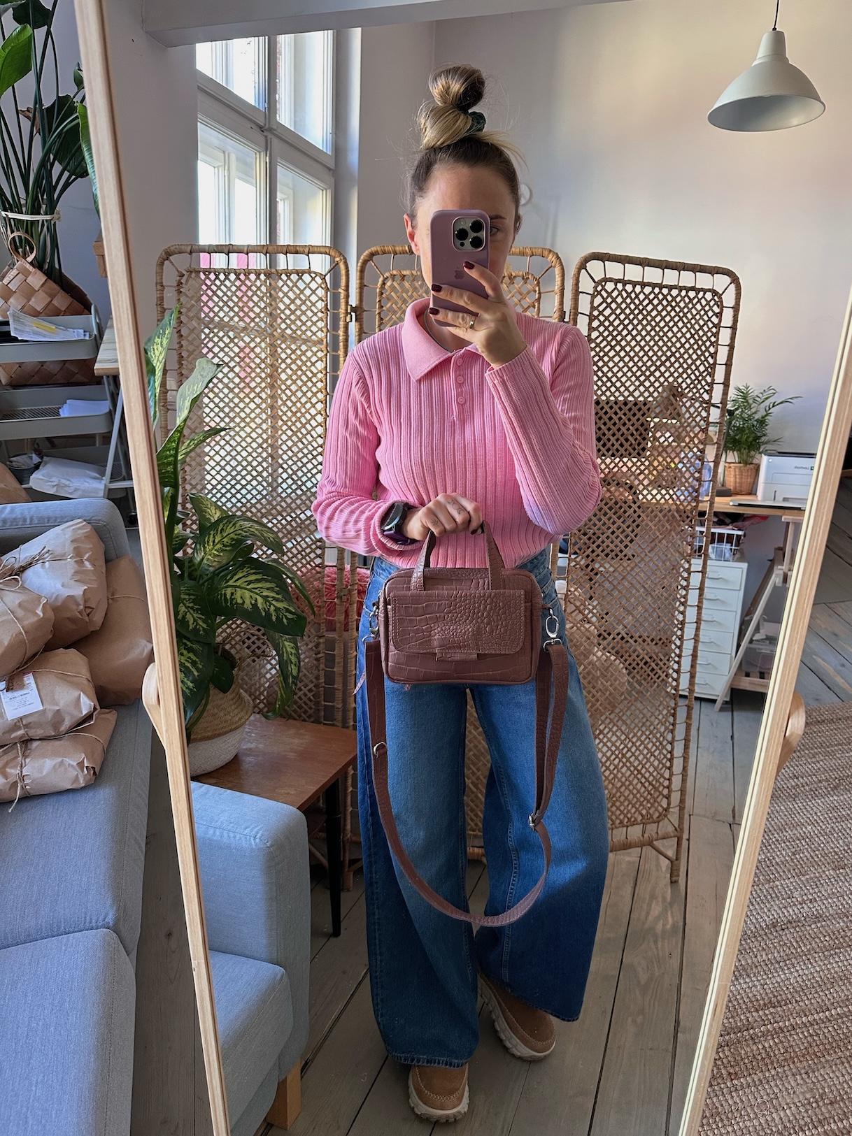 Uszyta ze skóry naturalnej licowej.