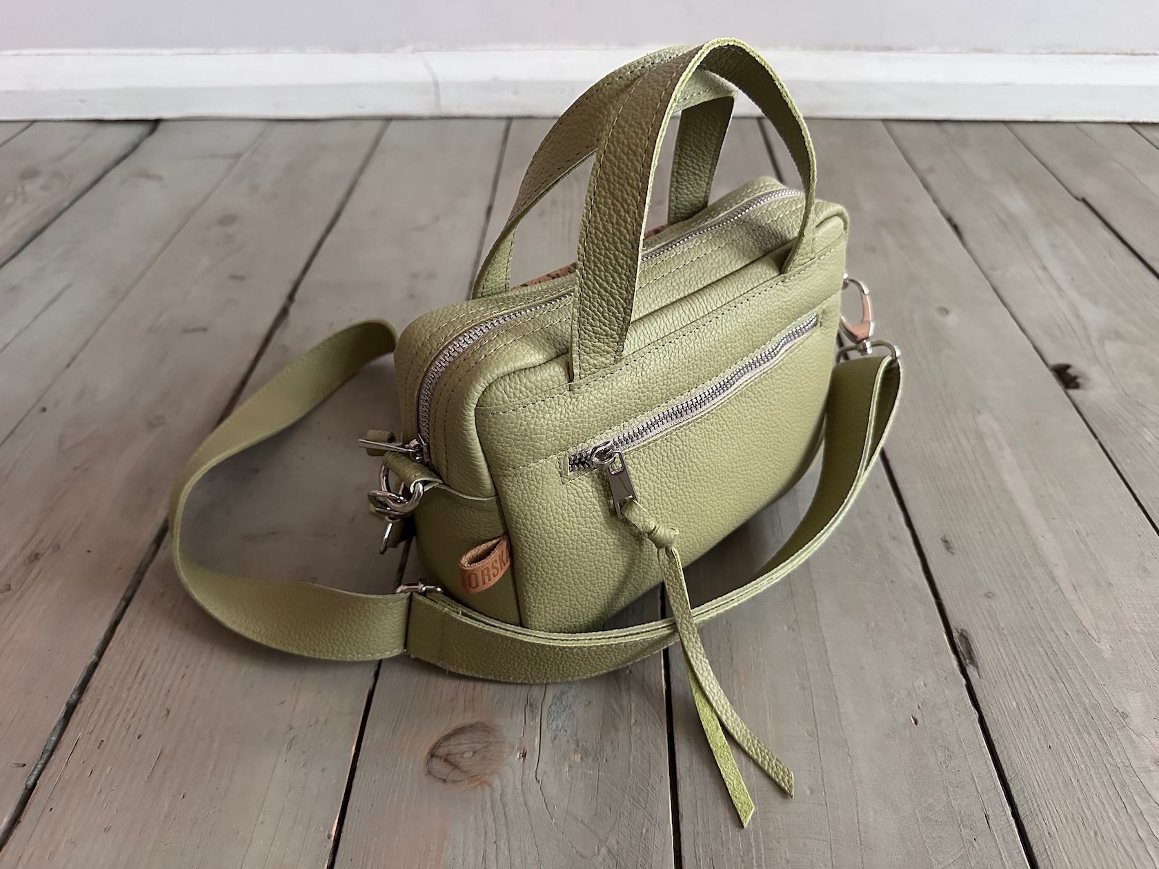 Uszyta ze skóry naturalnej licowej +welurowej.