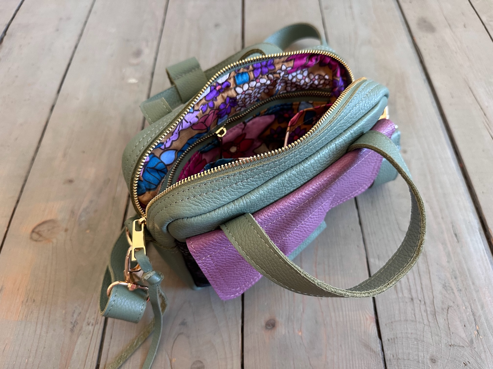 Wewnątrz kieszonka na zamek + dwie kieszonki wsuwki.