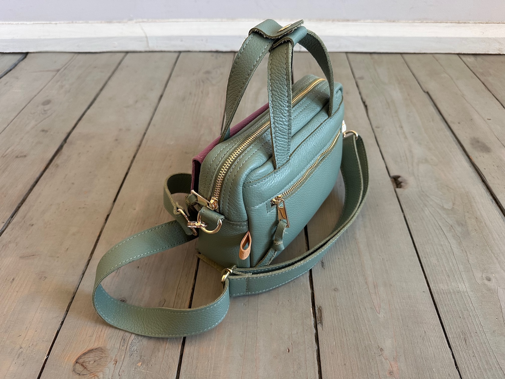 Uszyta ze skóry naturalnej licowej.
