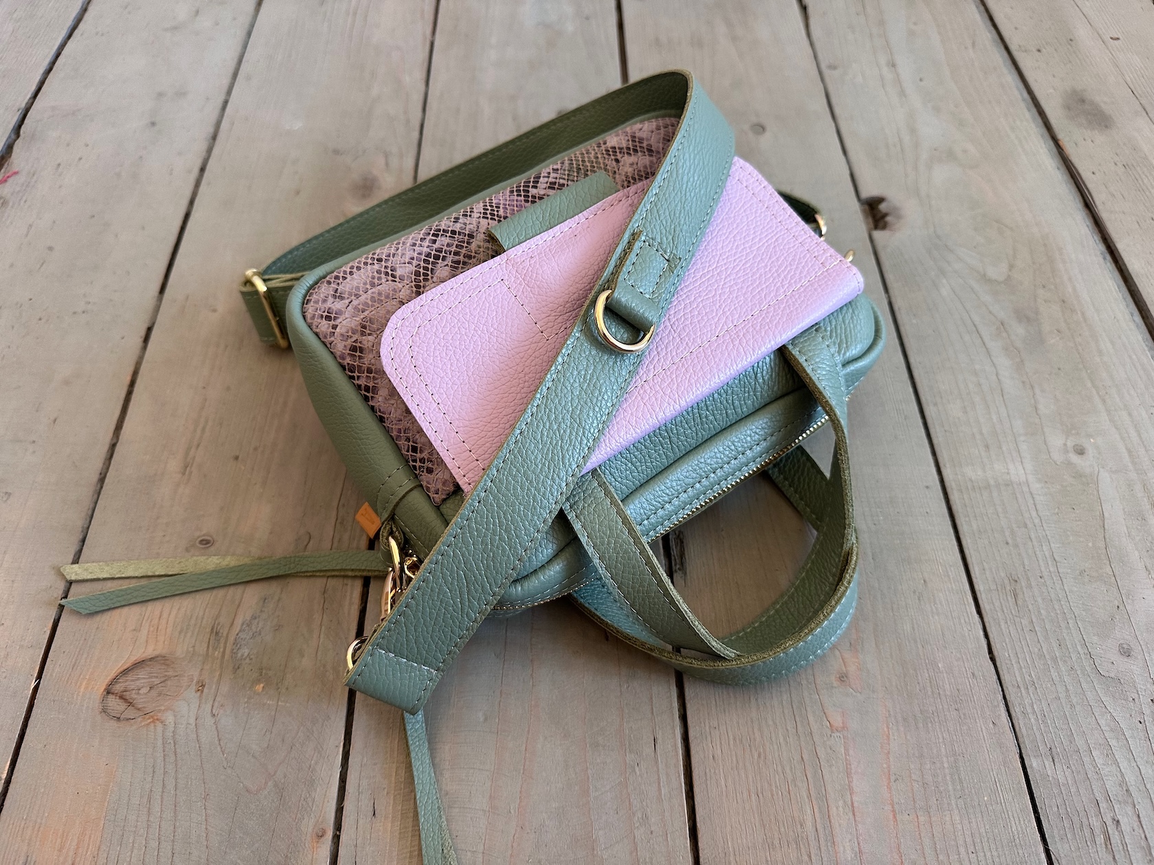 Zewnątrz naszyta kieszonka z klapką zamykana na magnes + kieszonka na zamek z tyłu.