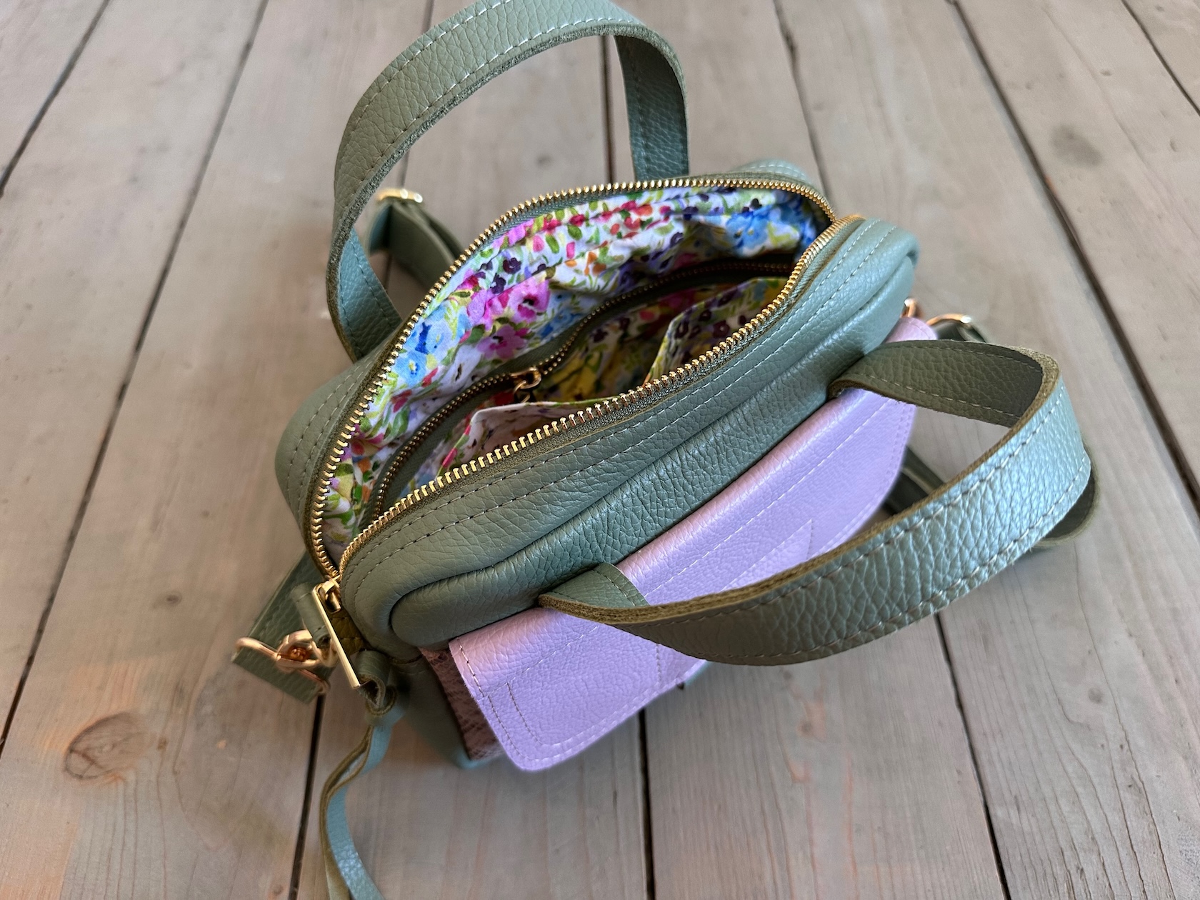 Wewnątrz kieszonka na zamek + dwie kieszonki wsuwki.