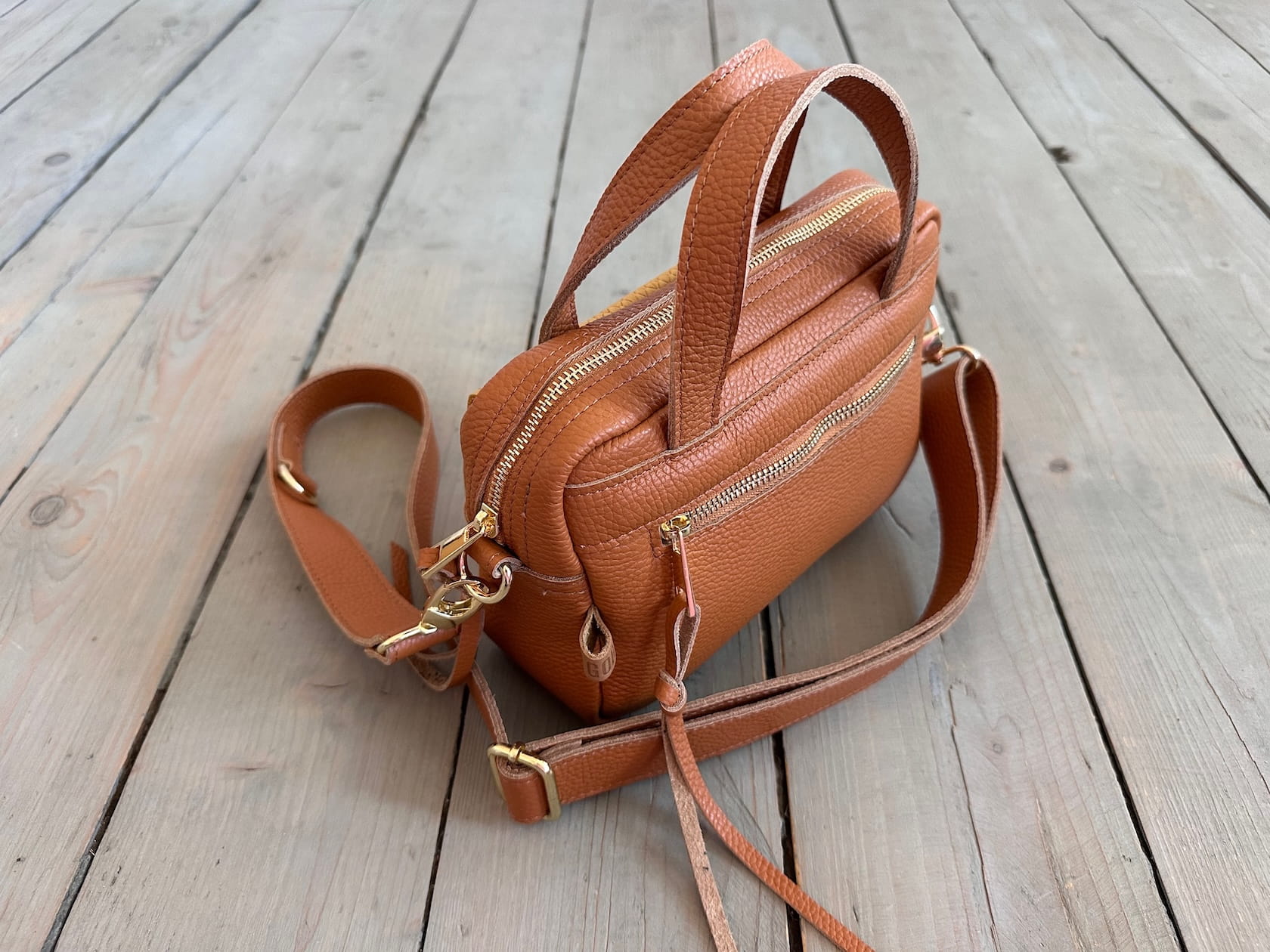Uszyta ze skóry naturalnej licowej.