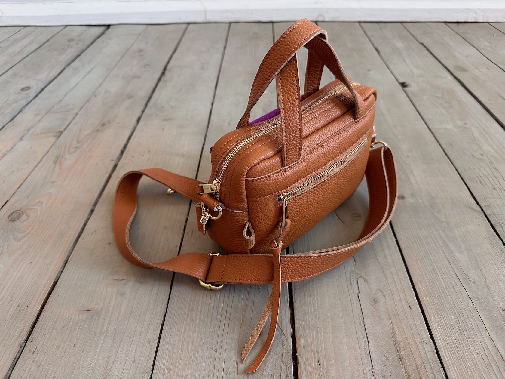 Uszyta ze skóry naturalnej licowej.