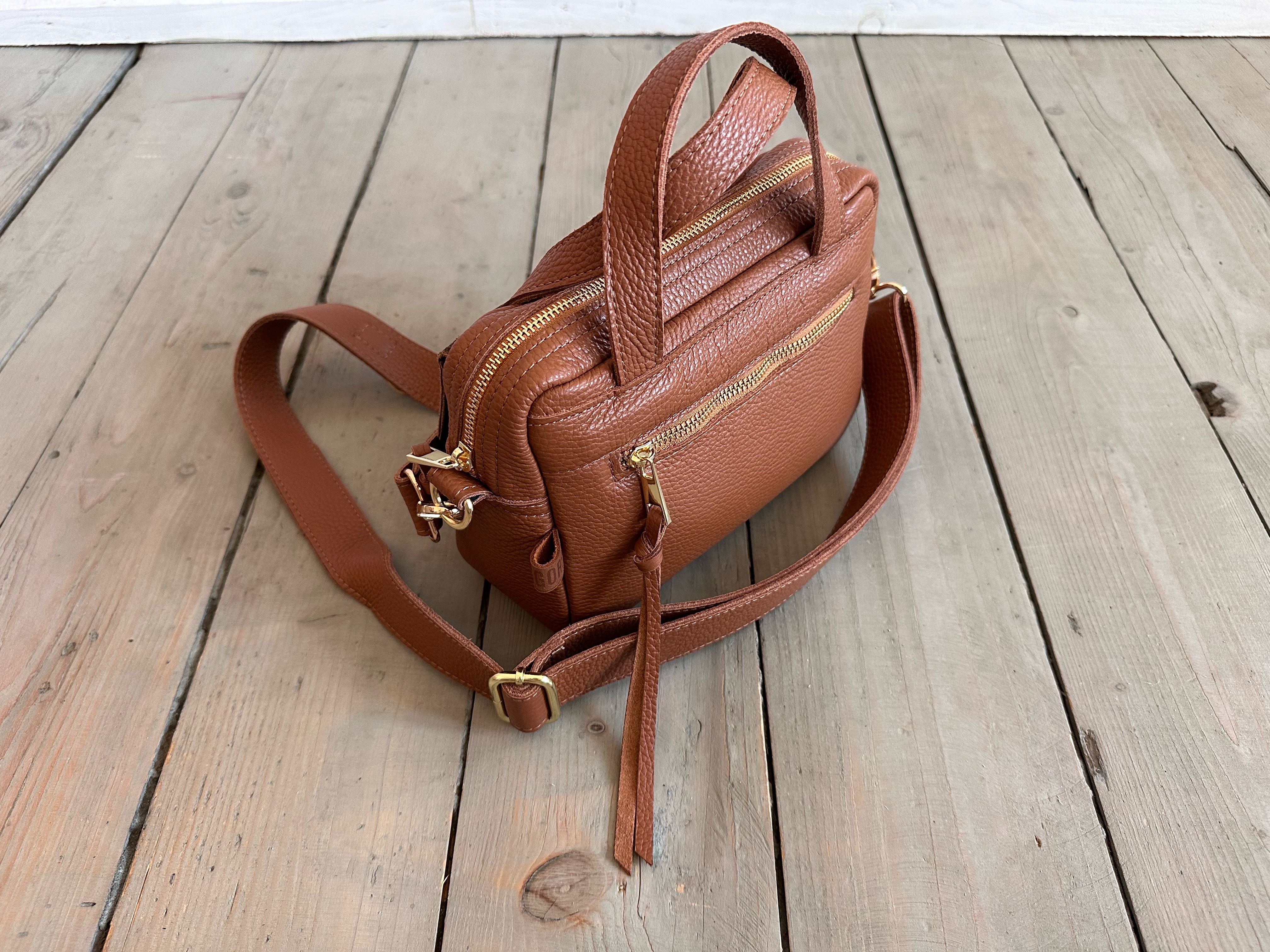 Uszyta ze skóry naturalnej licowej + welurowej.