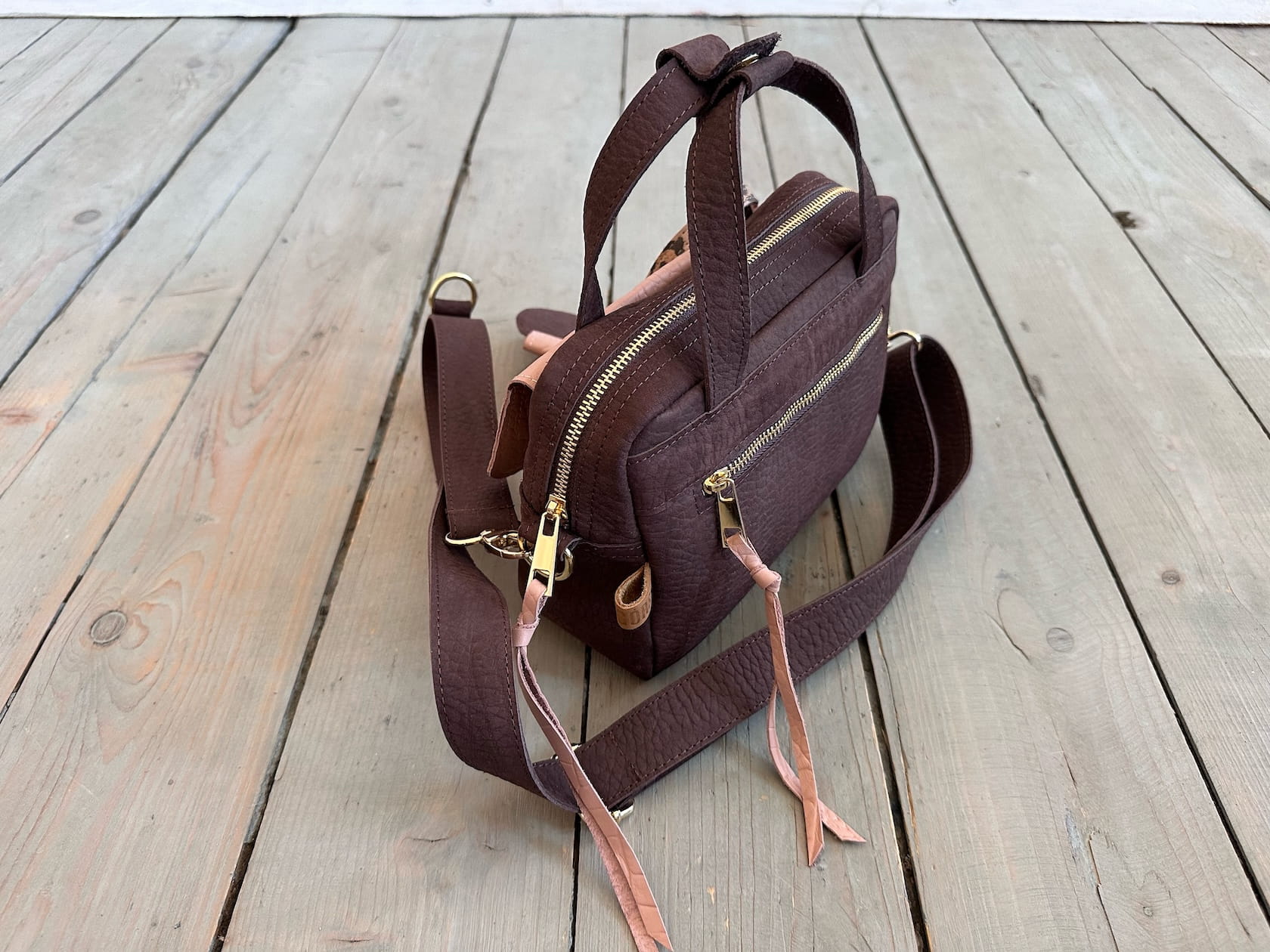 Uszyta ze skóry naturalnej nubukowej + licowej.