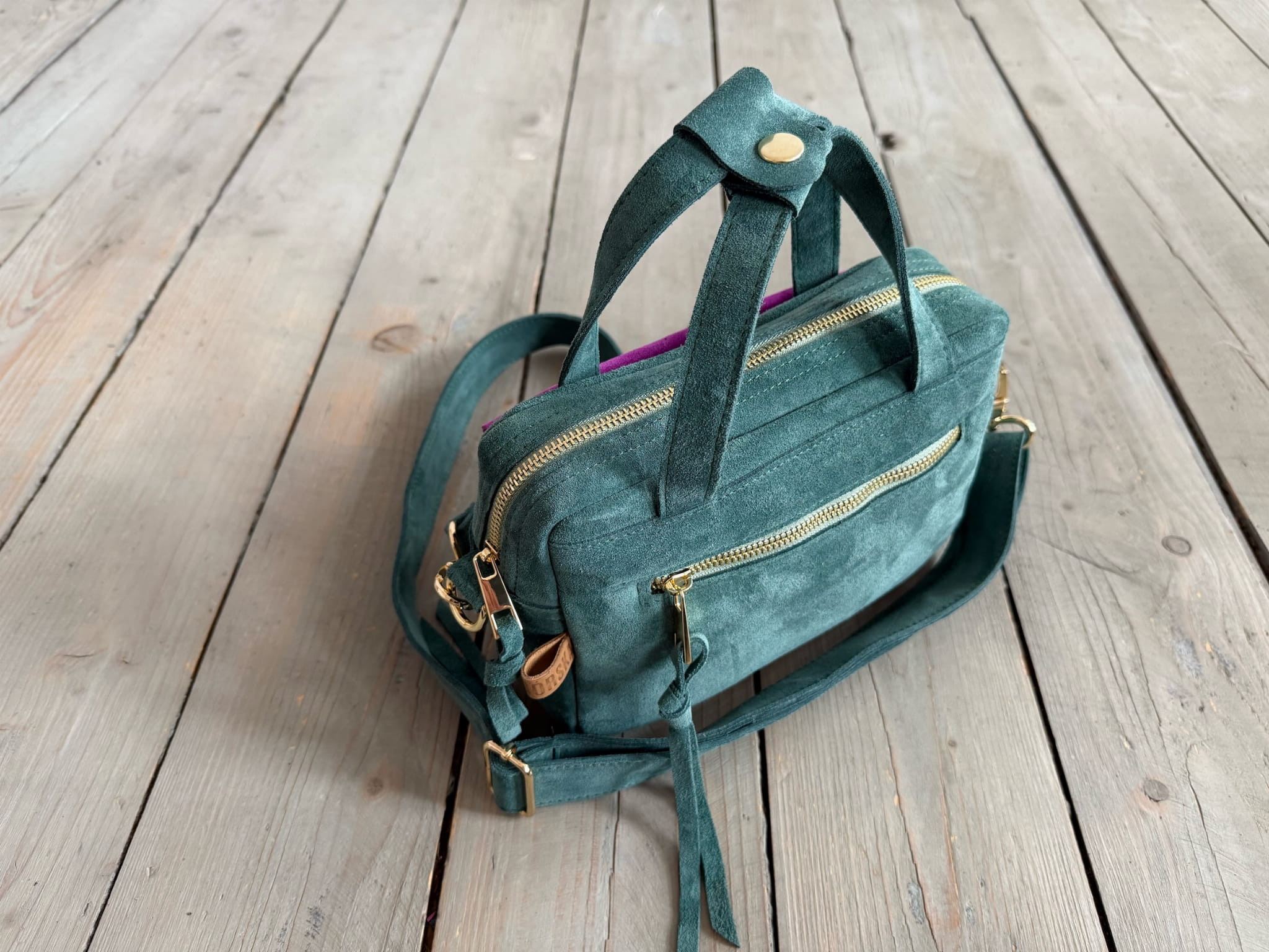 Uszyta ze skóry naturalnej welurowej.