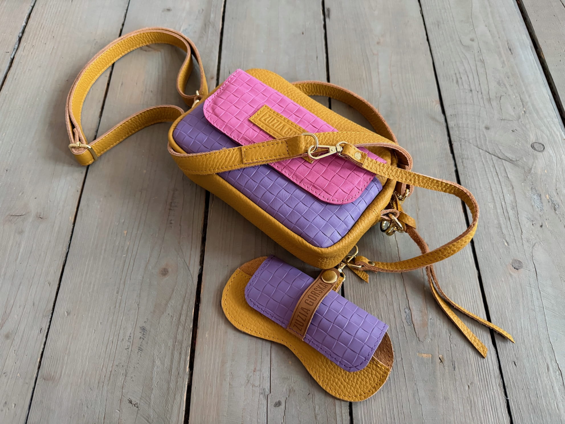 Uszyta ze skór naturalnej garbowanej roślinnie.