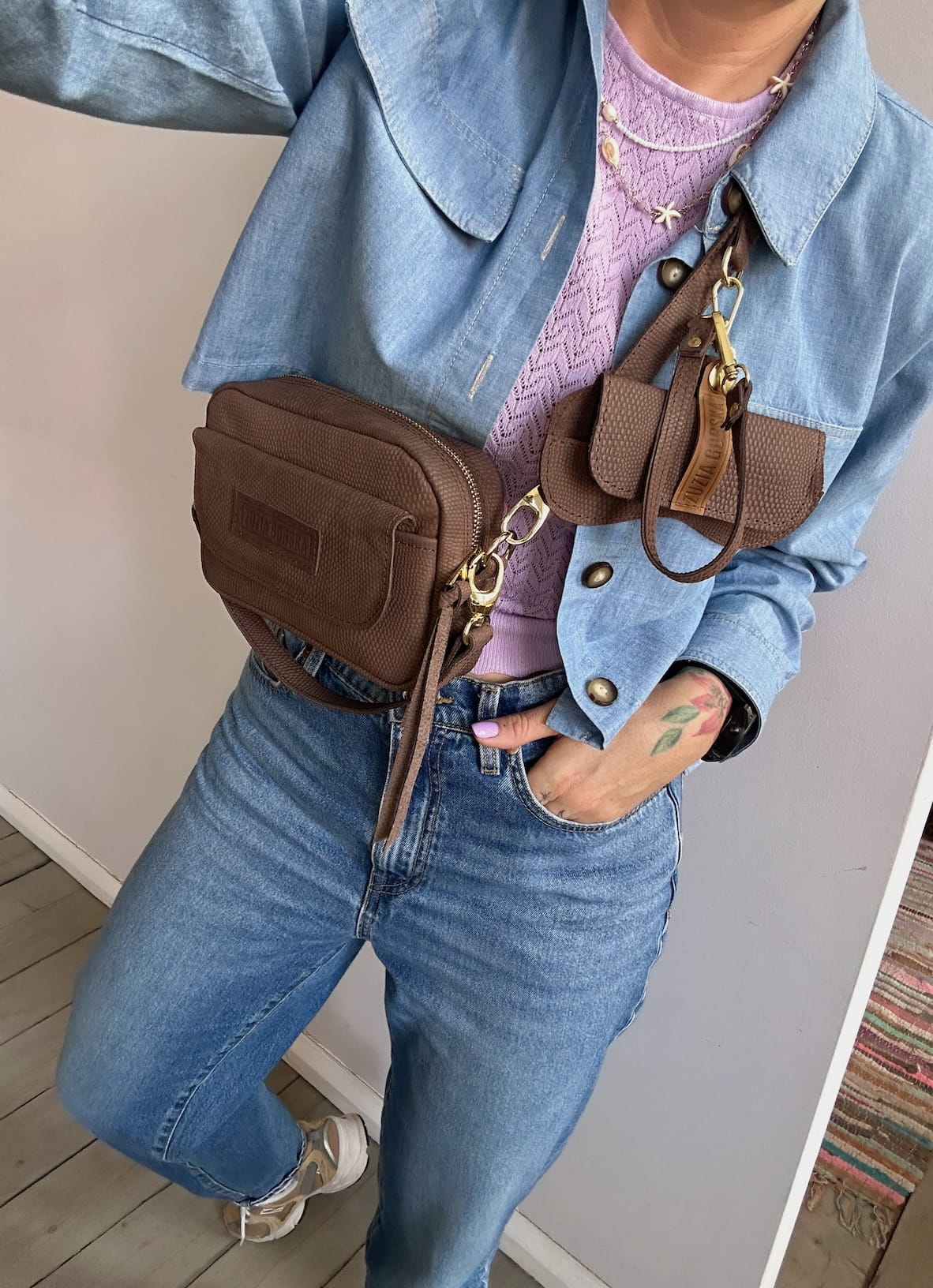 Torebka, która może być noszona przez ramię na skos lub w dłoni.