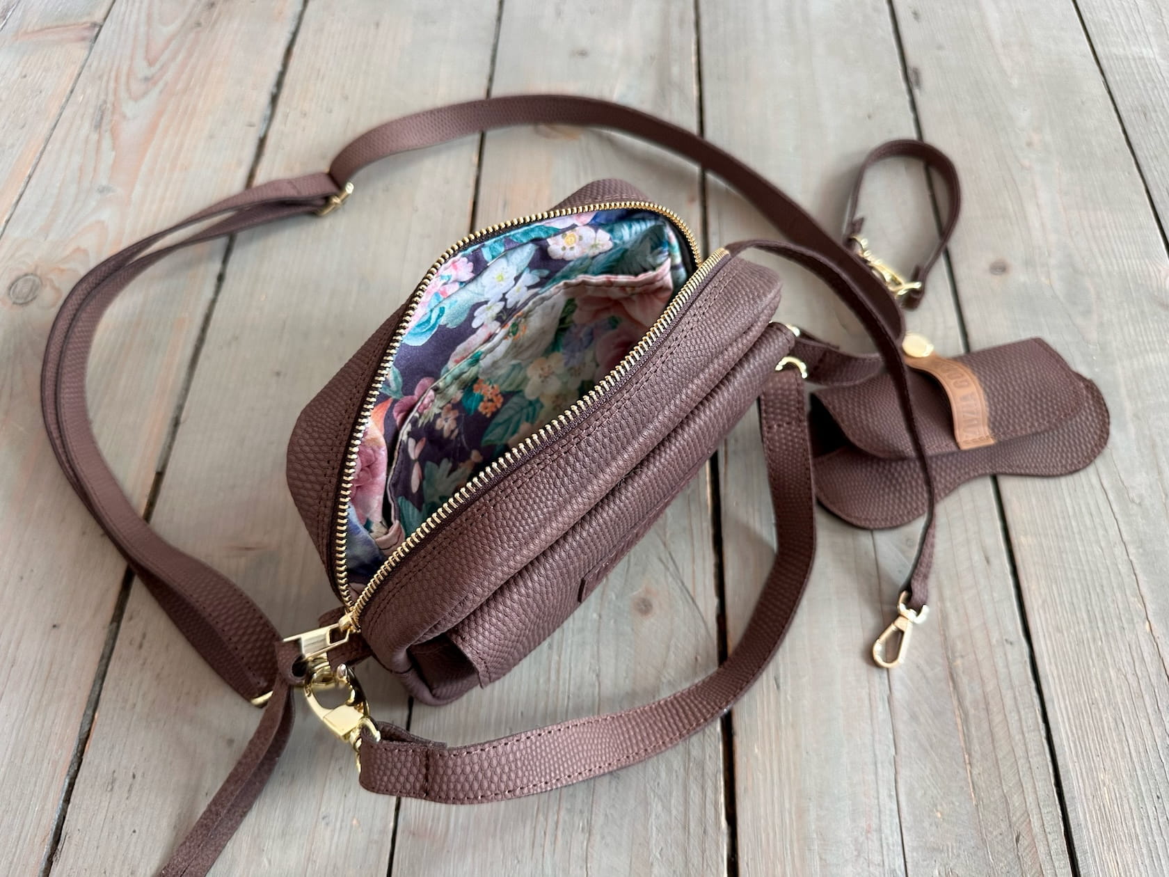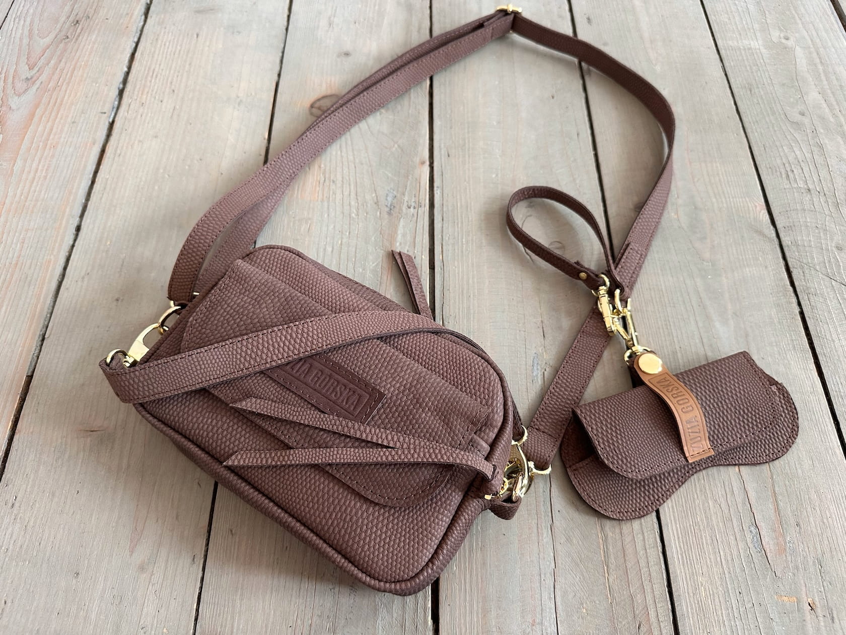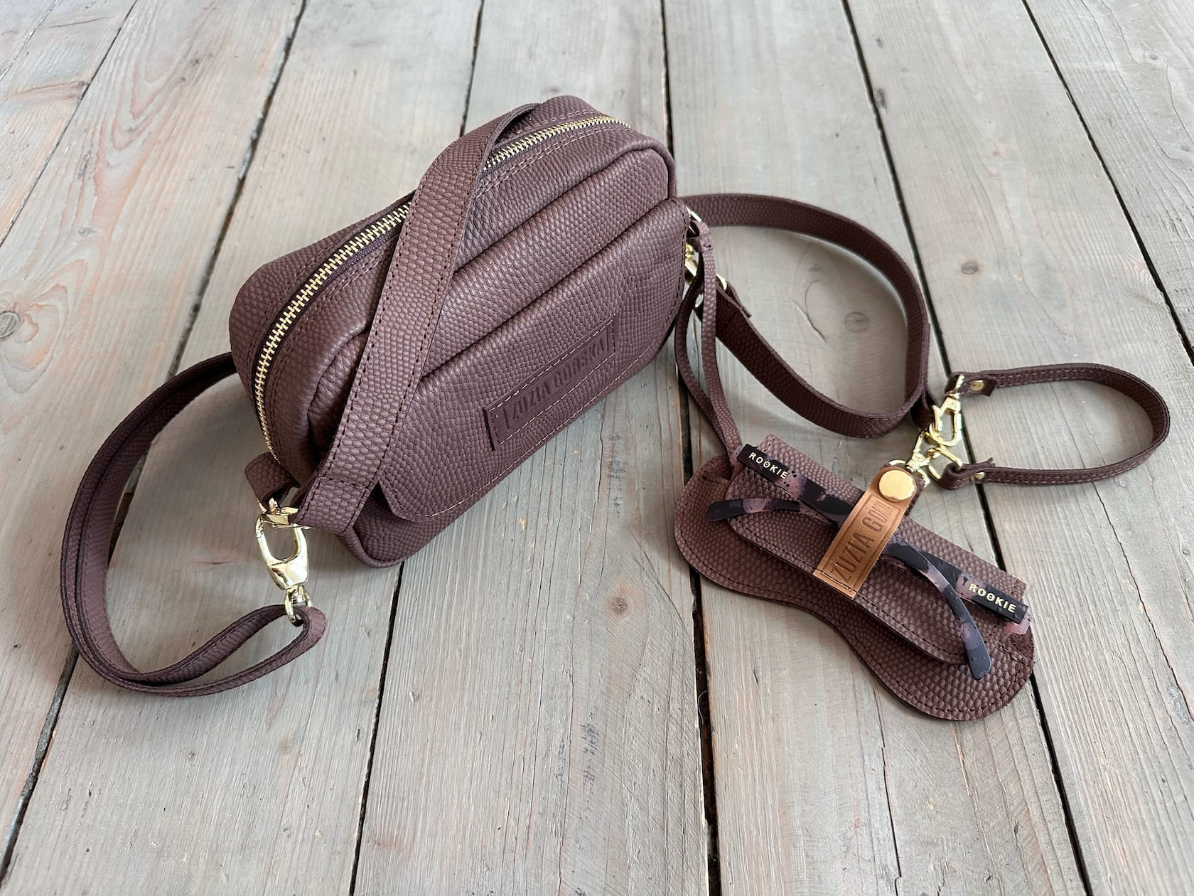 Z tyłu kieszonka na zamek, z przodu kiszona pod klapką, wewnątrz przegródka + smyczka z karabińczykiem.