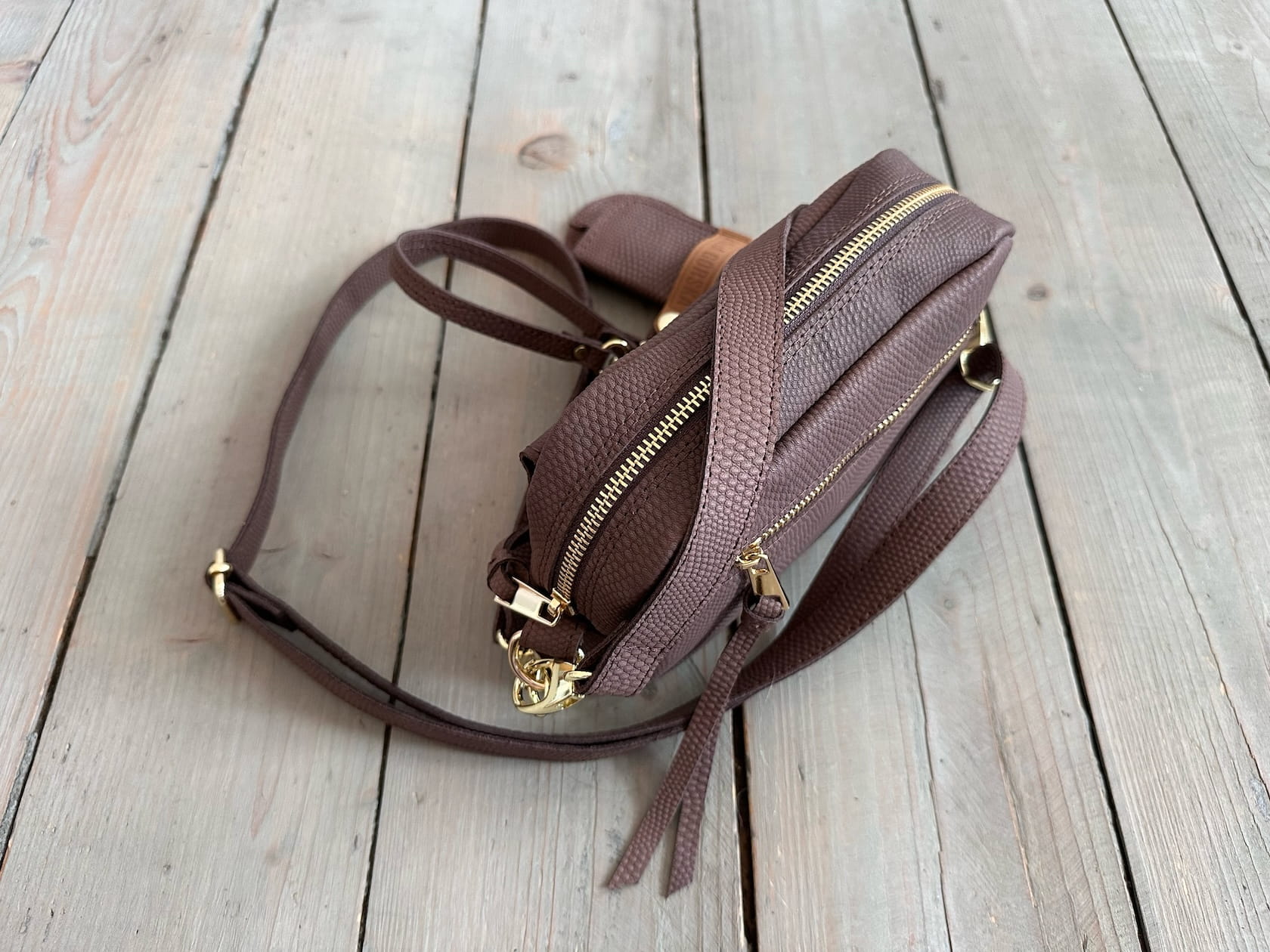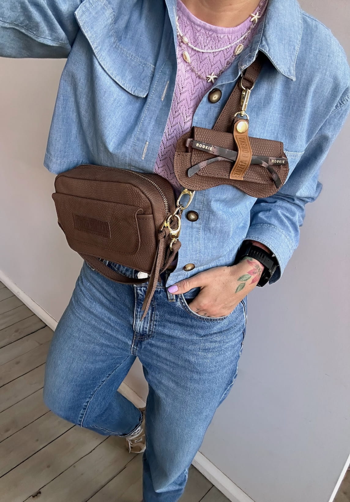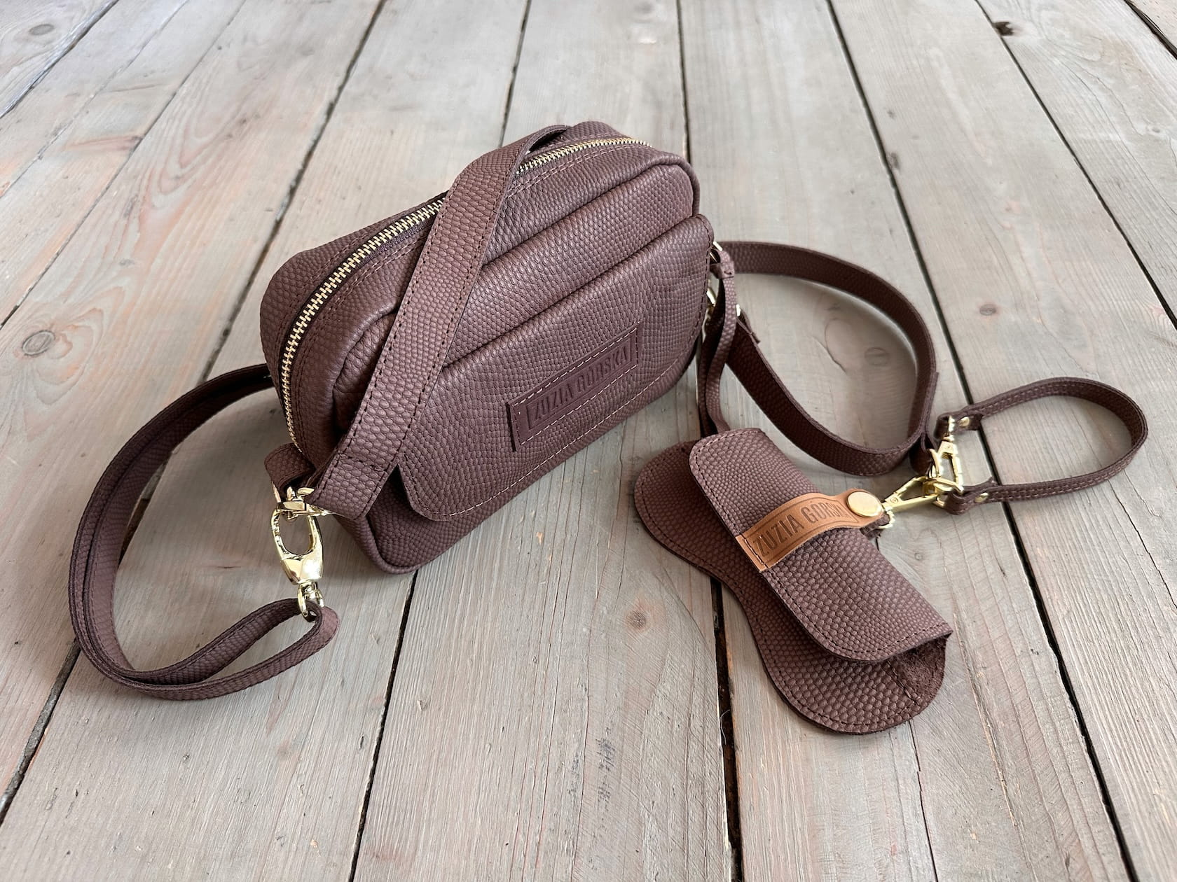 Z tyłu kieszonka na zamek, z przodu kiszona pod klapką, wewnątrz przegródka + smyczka z karabińczykiem.