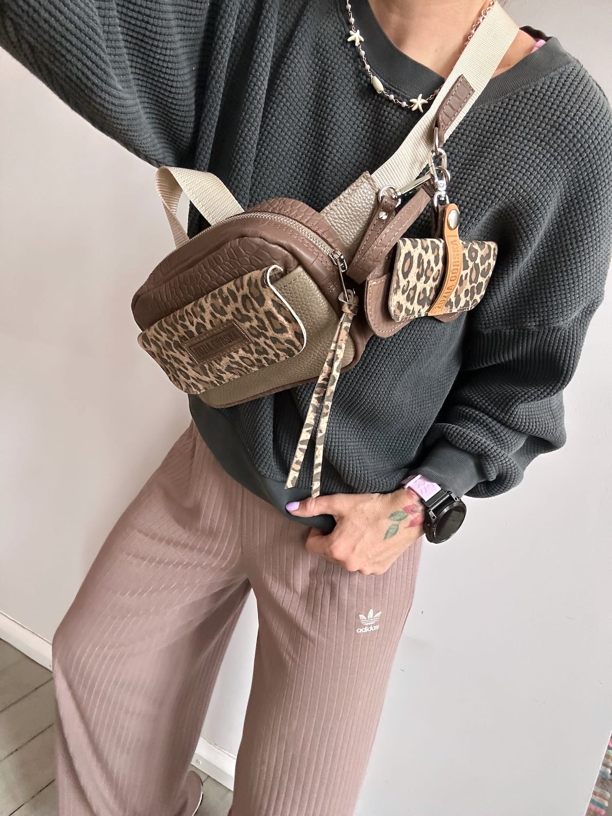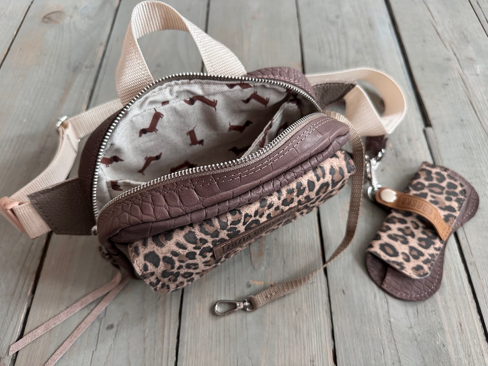 Z tyłu kieszonka na zamek, z przodu kiszona pod klapką, wewnątrz przegródka + smyczka z karabińczykiem.