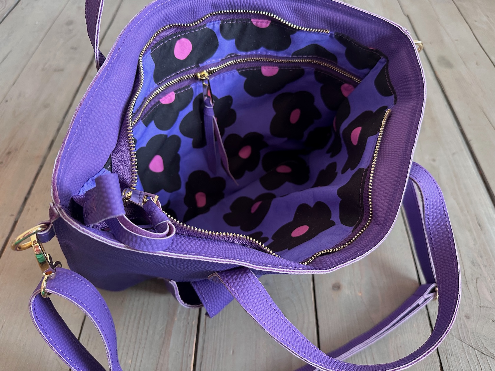 Torba uszyta ze skóry naturalnej nubukowej z podszewką 100% bawełny.