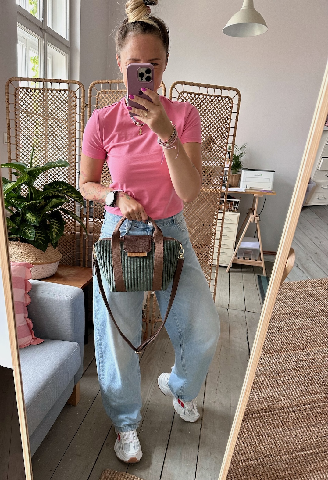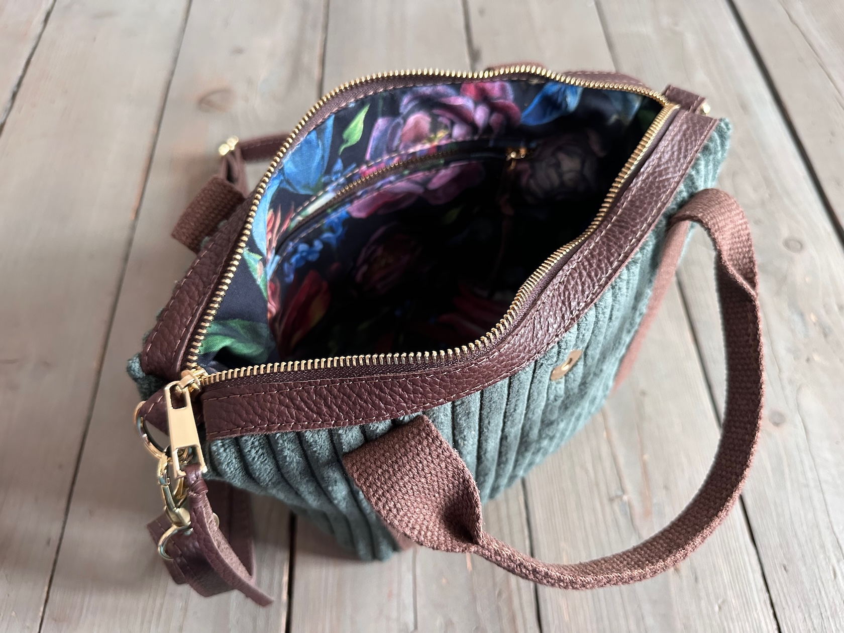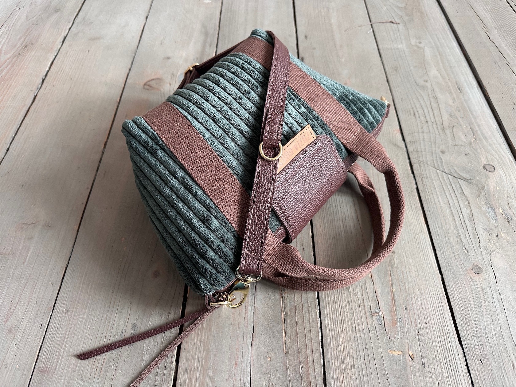 Uszyta z tkaniny tapicerskiej + skóry naturalnej licowej + bawełnianej podszewki.