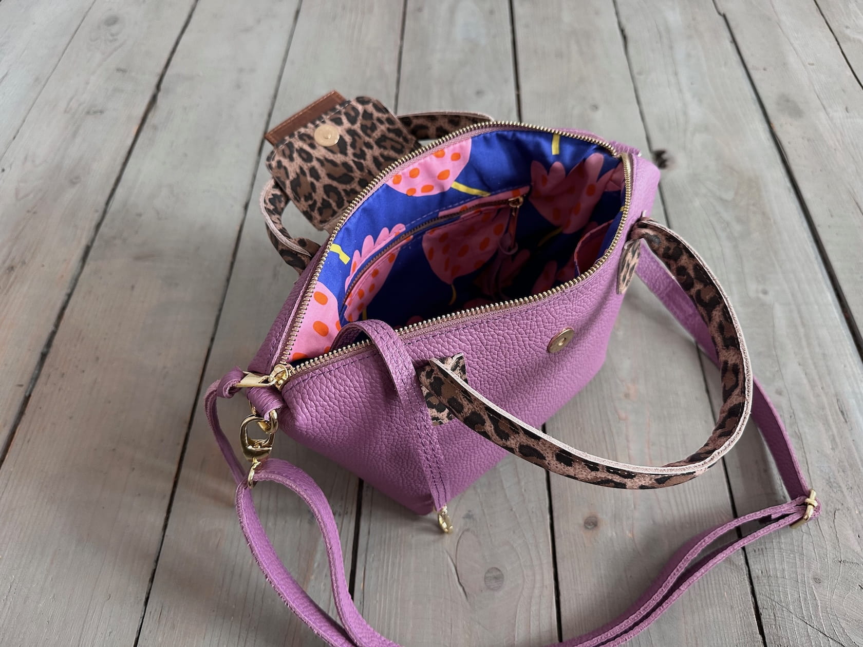 Wewnątrz kieszonka na zamek i dwie kieszonki wsuwki oraz smyczka z karabińczykiem.