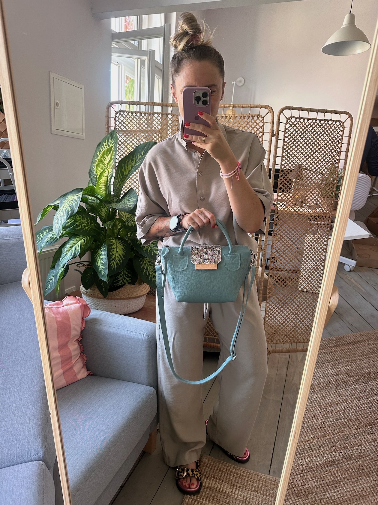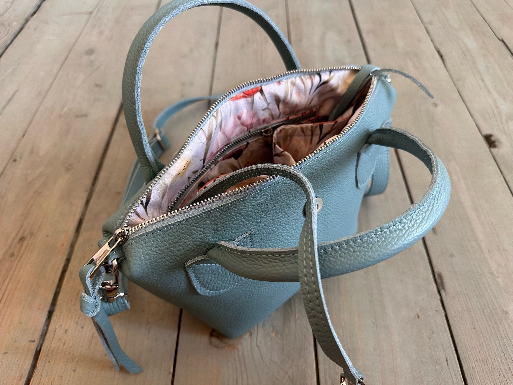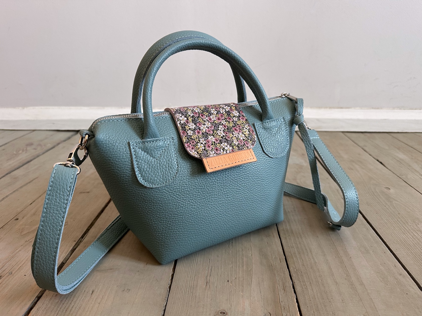 Uszyta ze skóry naturalnej licowej + bawełnianej podszewki.