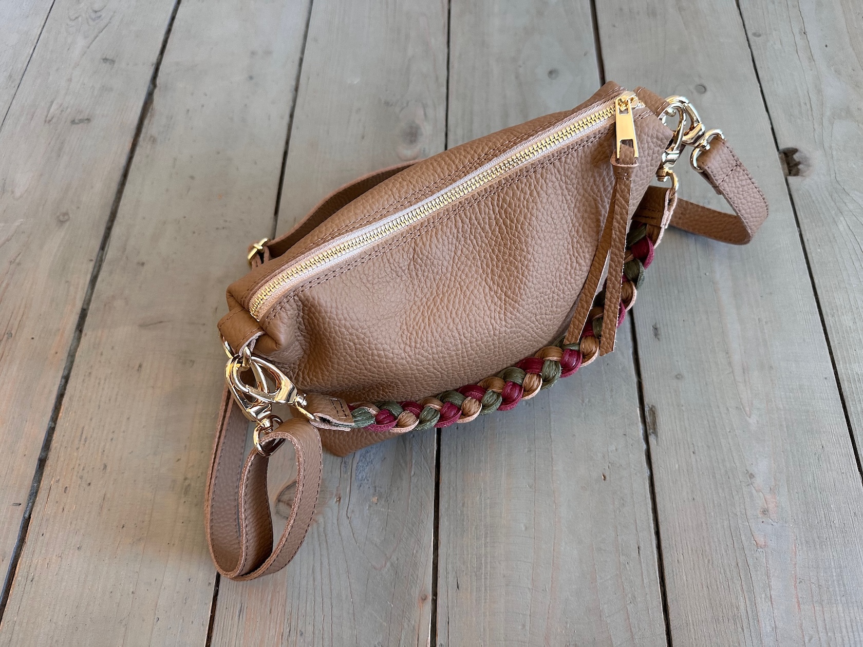 W komplecie z torebką jest długi, regulowany pasek i odpinana, pleciona rączka.