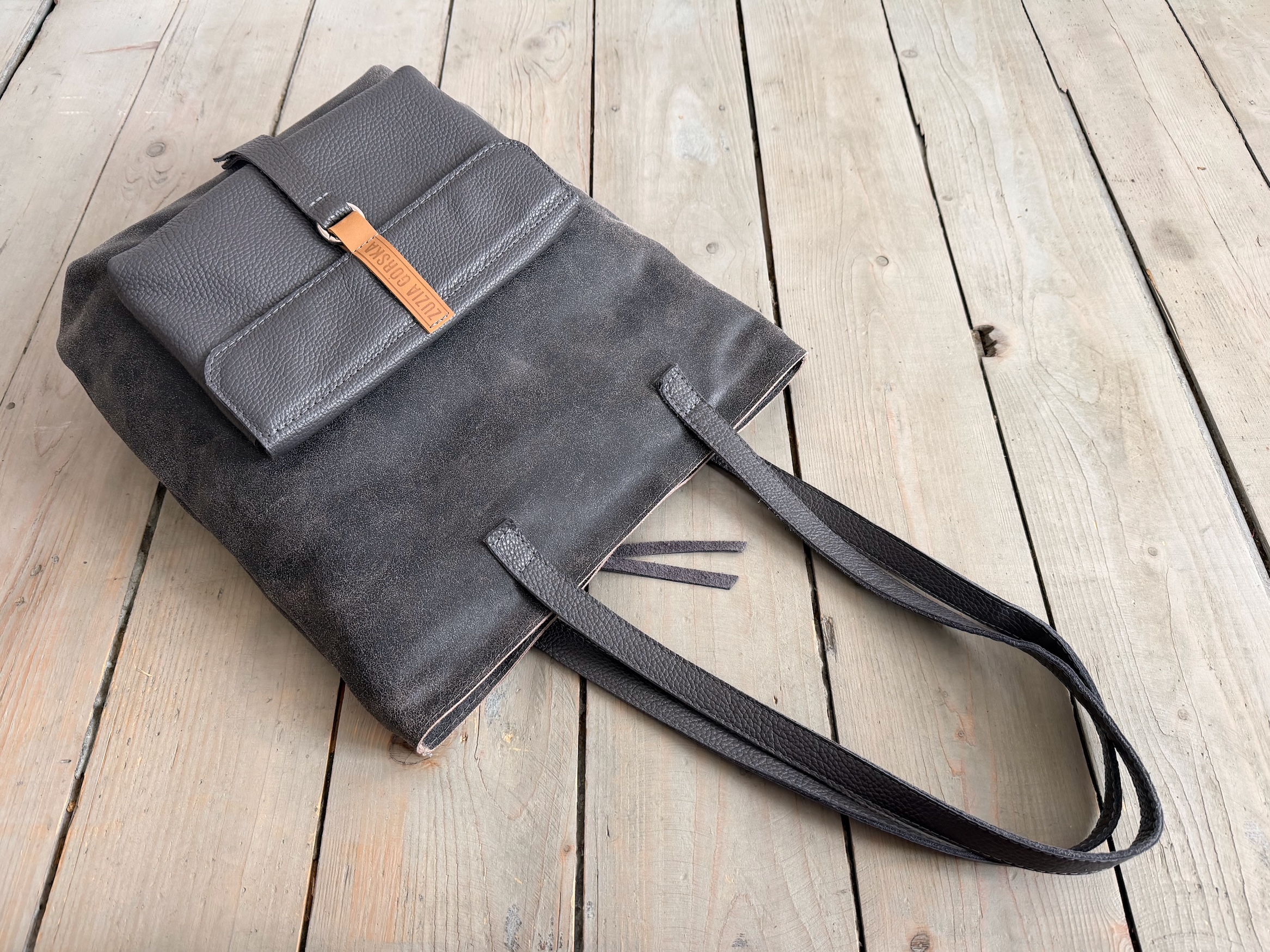 Uszyta ze skóry naturalnej welurowej + licowej + podszewka 100% bawełny.