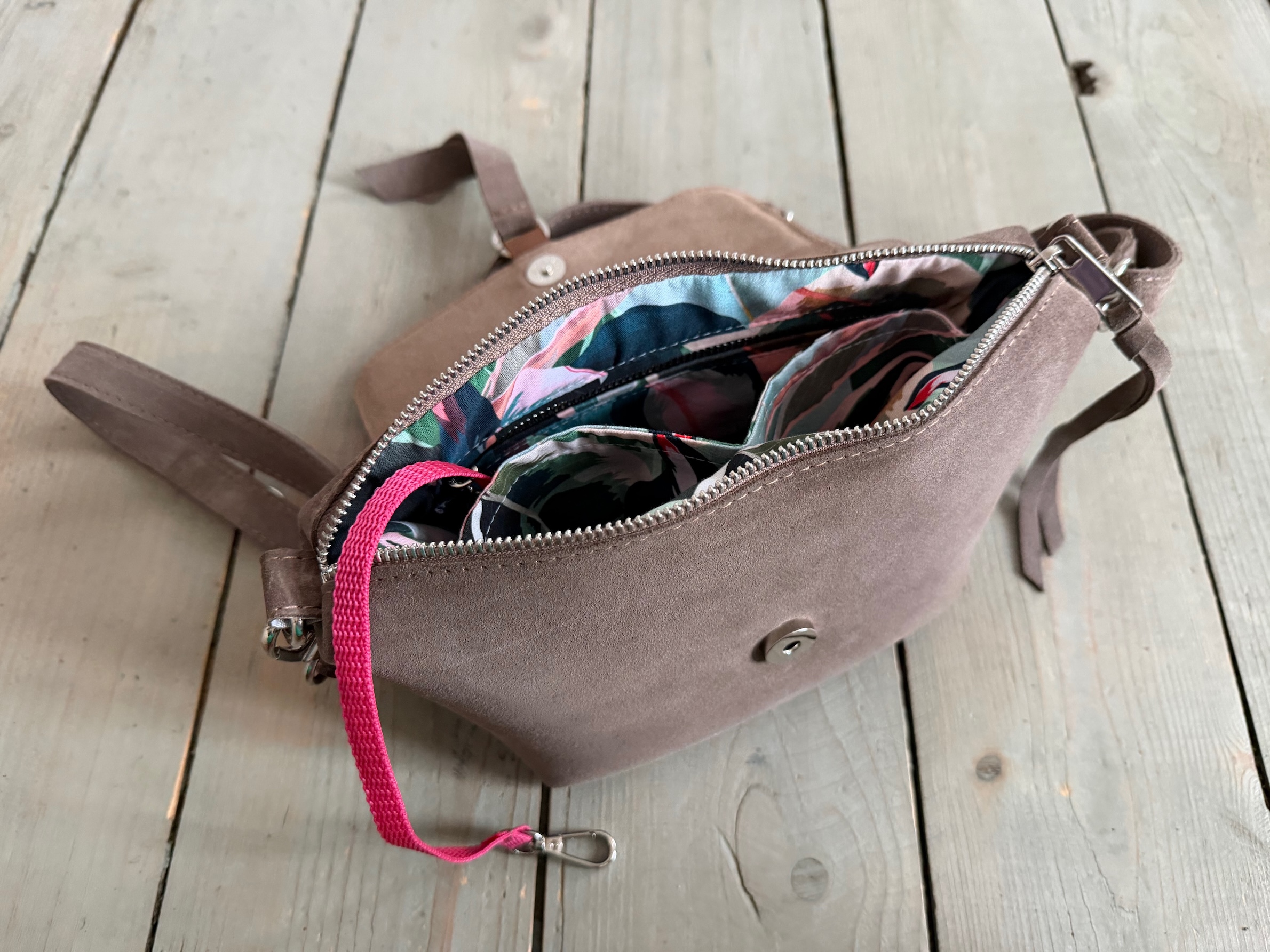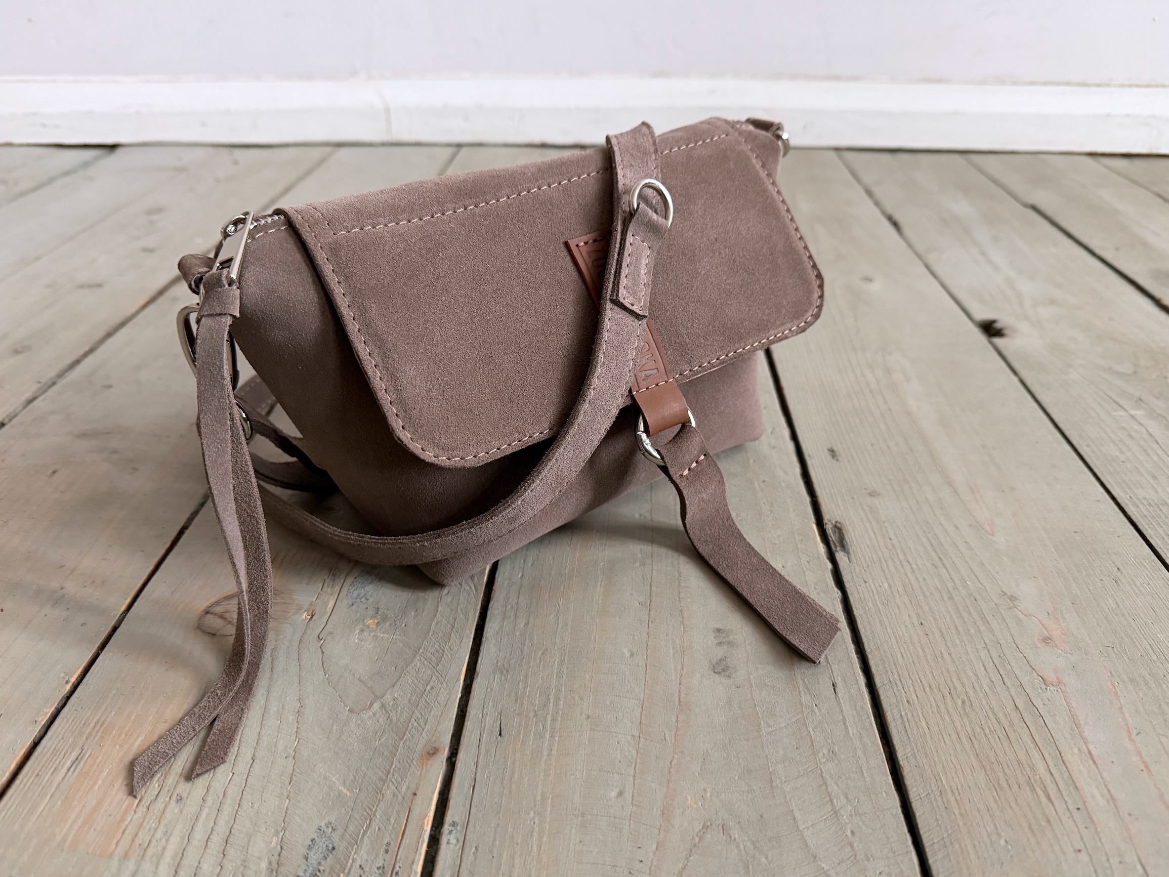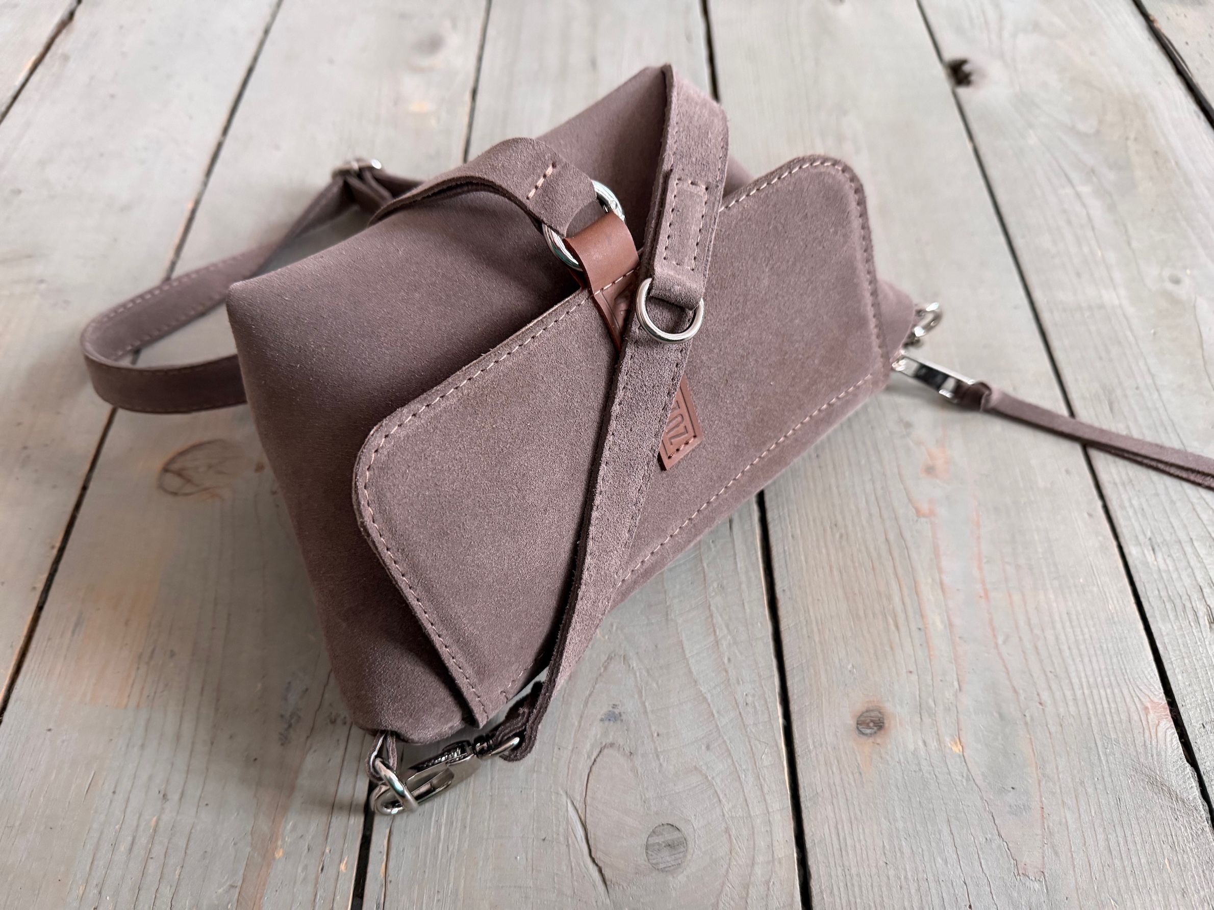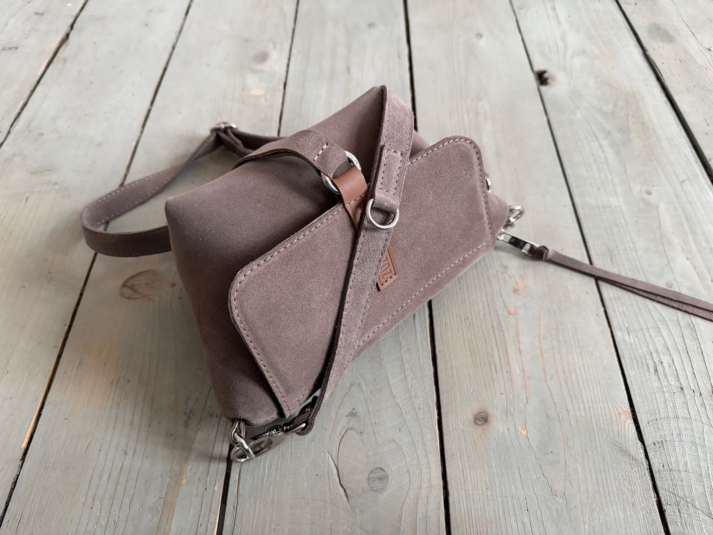 Uszyta ze skóry naturalnej welurowej + bawełnianej podszewki.