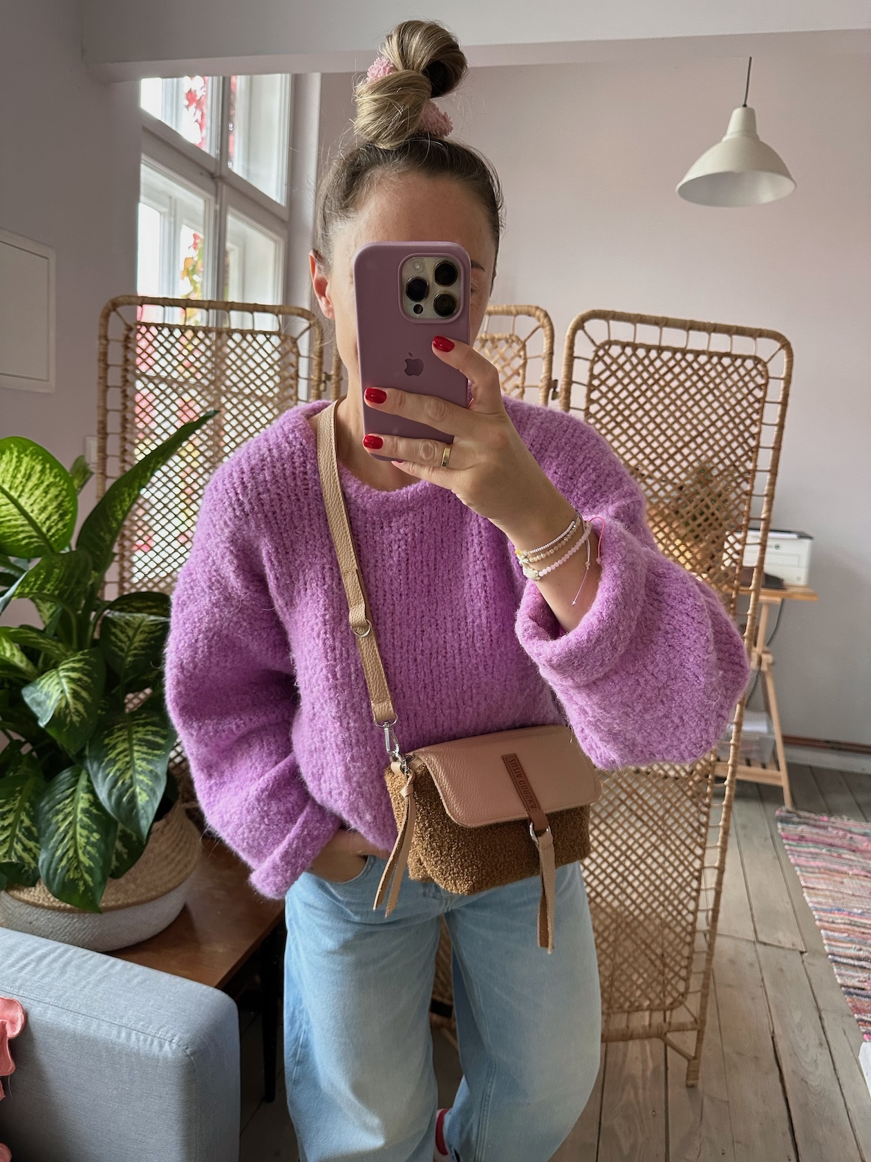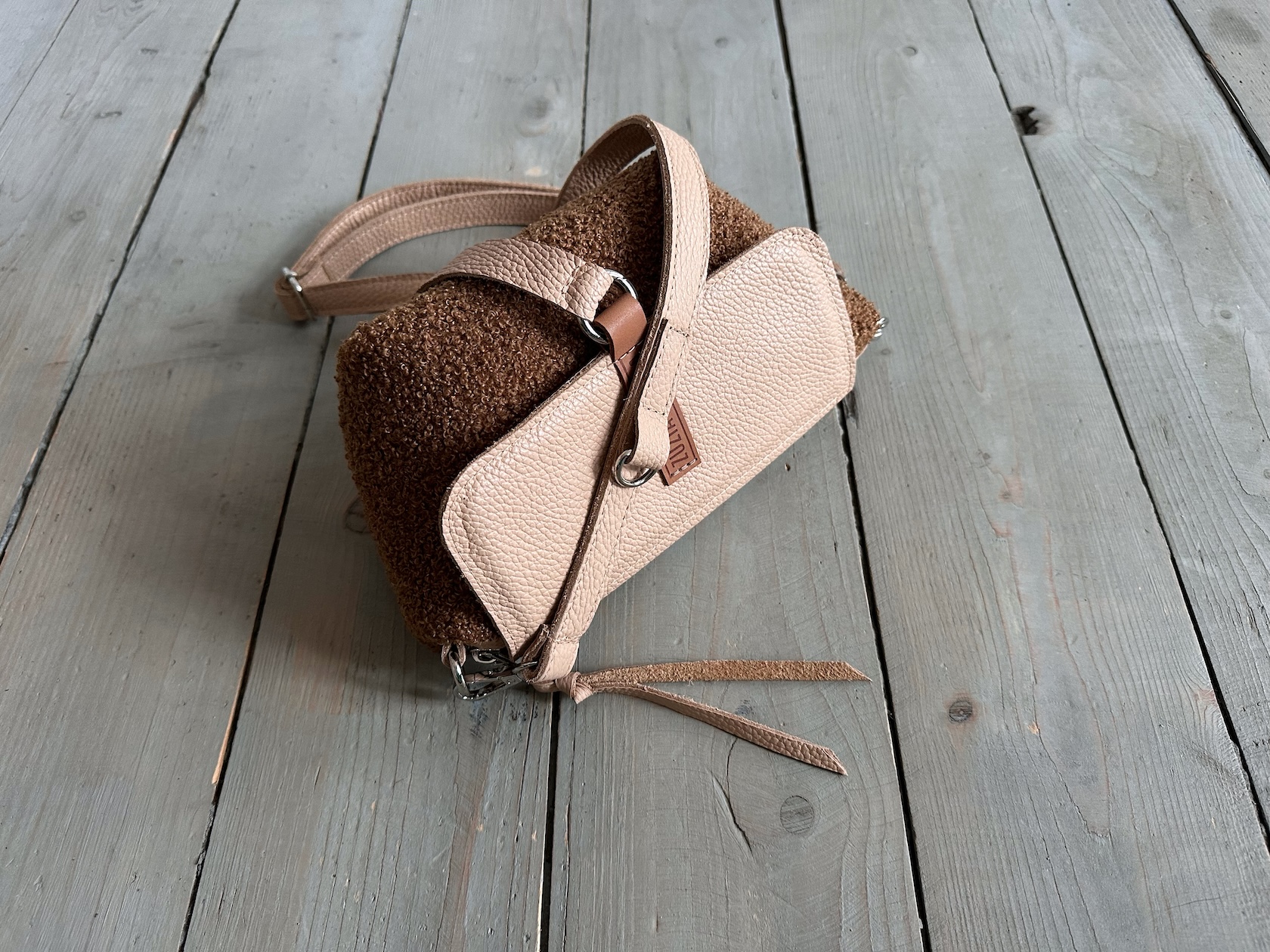 Uszyta z tkaniny misiowej-polarowej poliestrowej + skóry naturalnej licowej + bawełnianej podszewki.