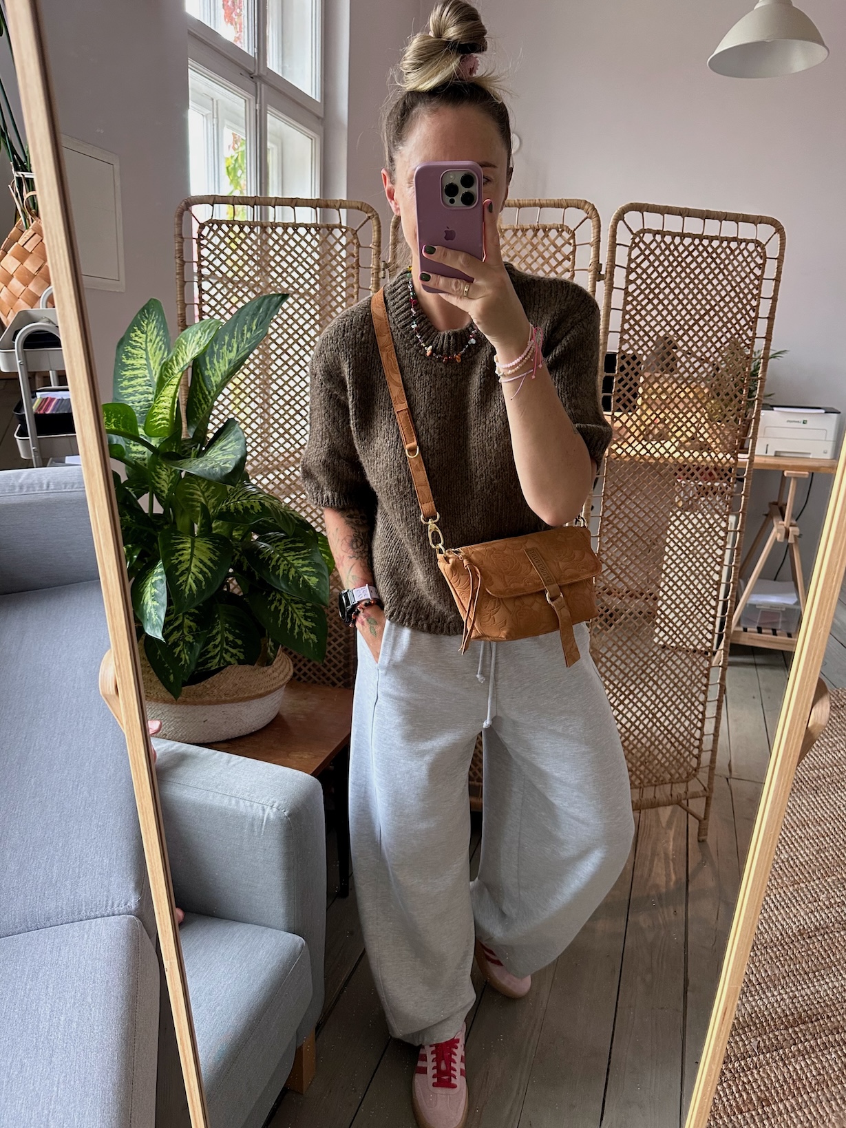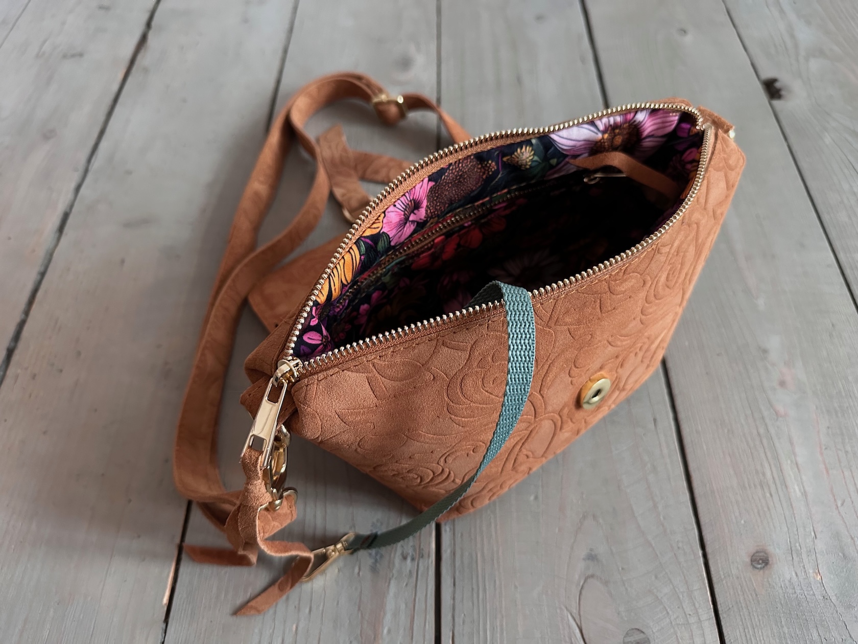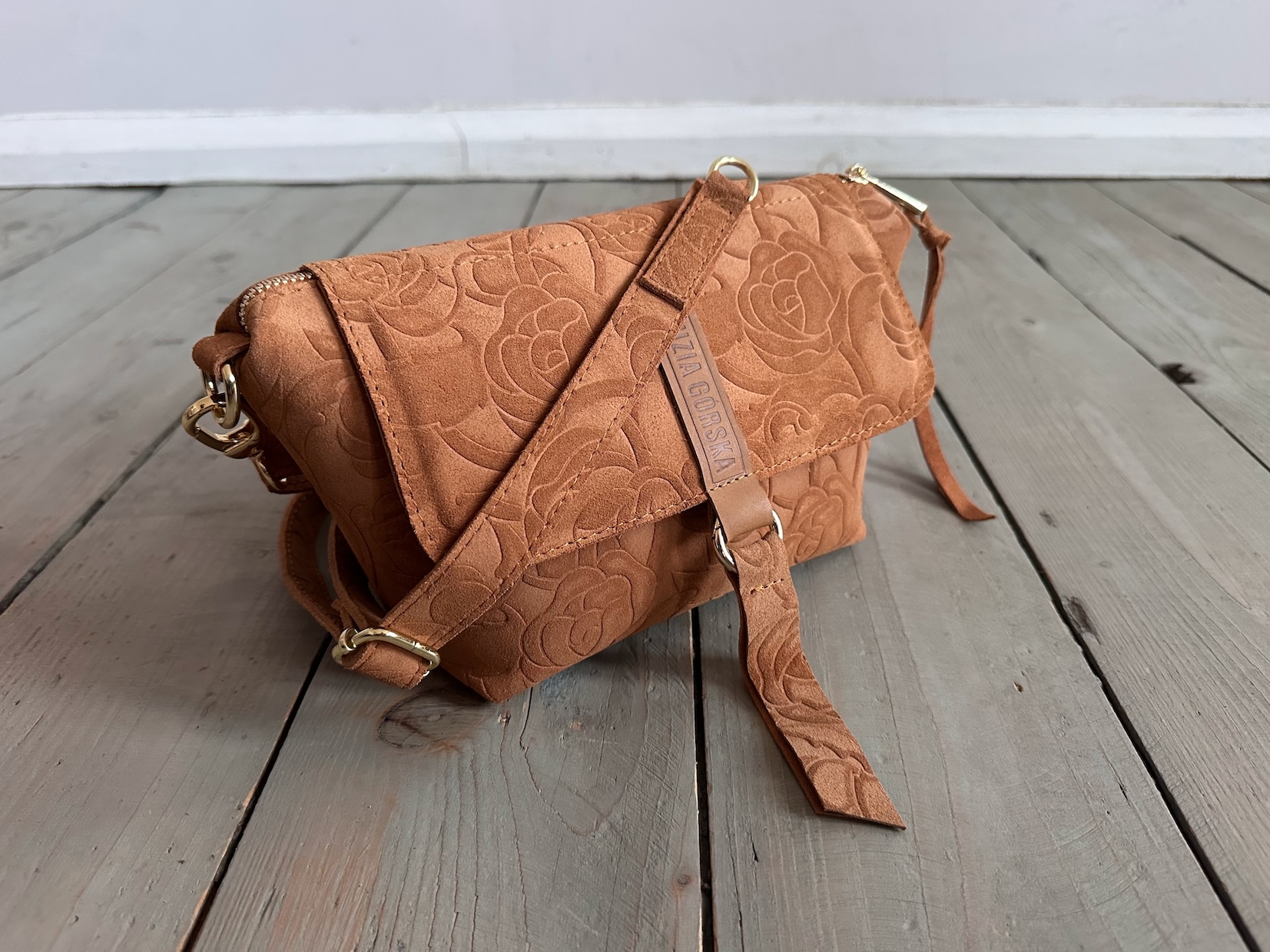 Uszyta ze skóry naturalnej welurowej + bawełnianej podszewki.