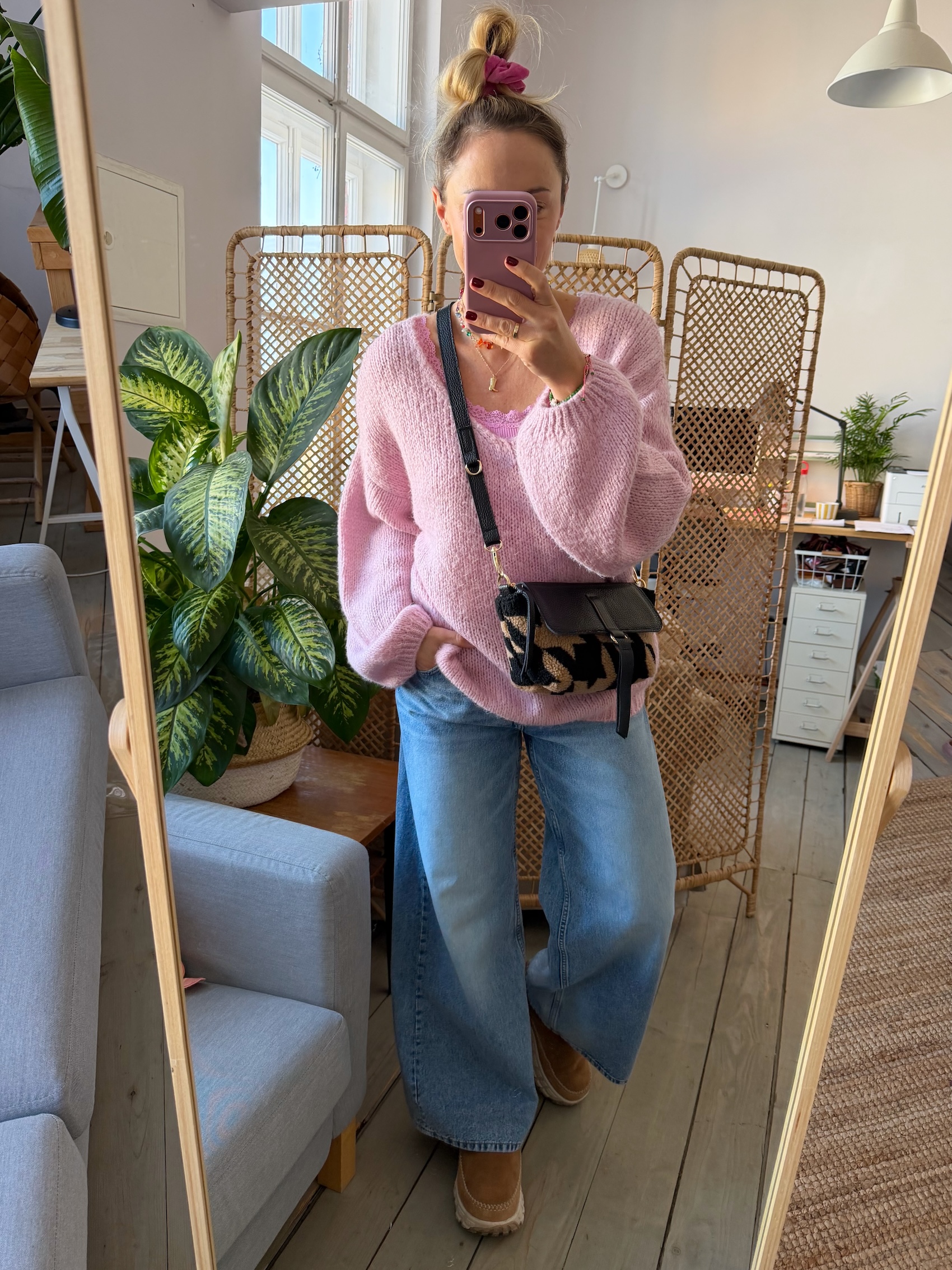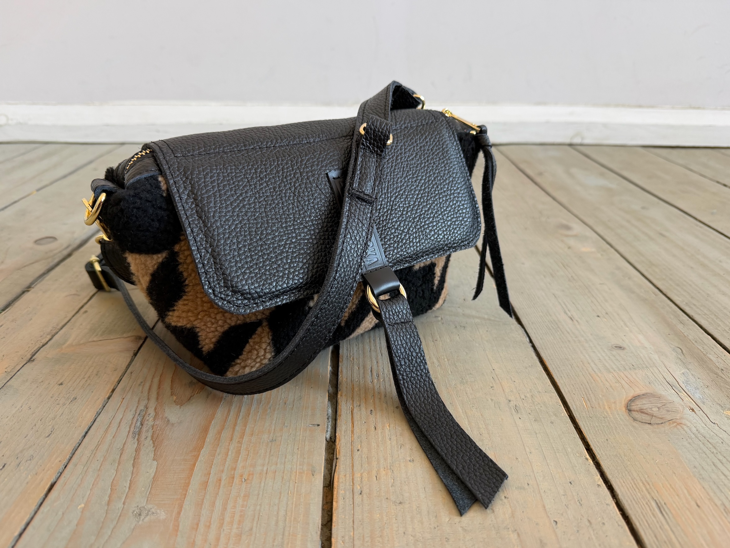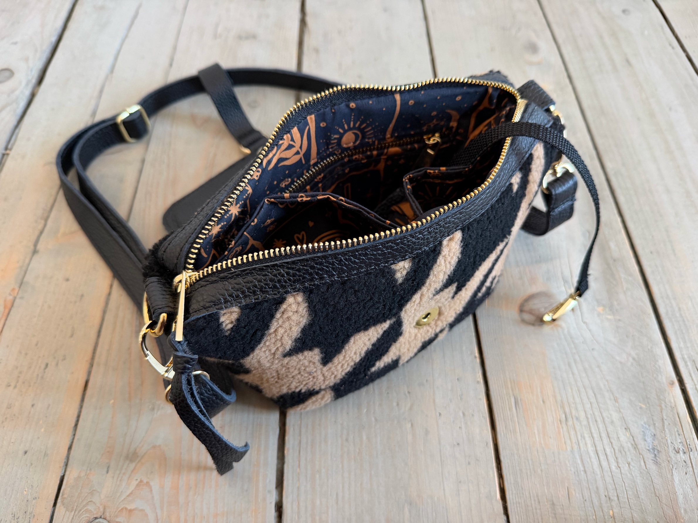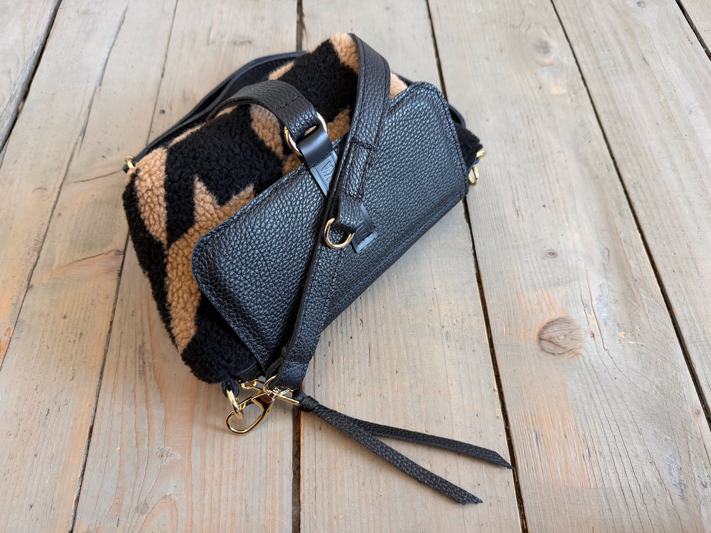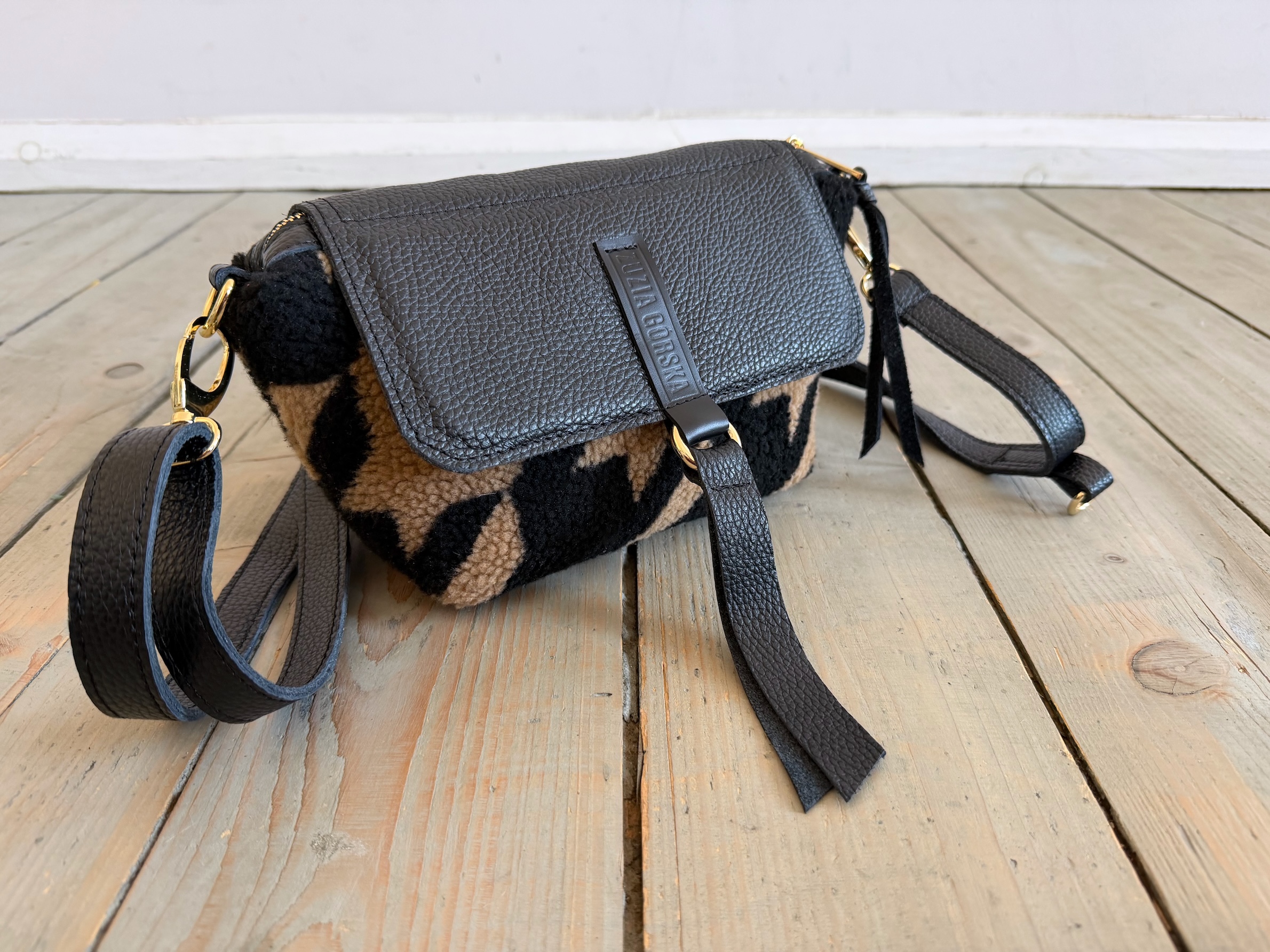 Uszyta z tkaniny misiowej-polarowej poliestrowej + skóry naturalnej licowej + bawełnianej podszewki.