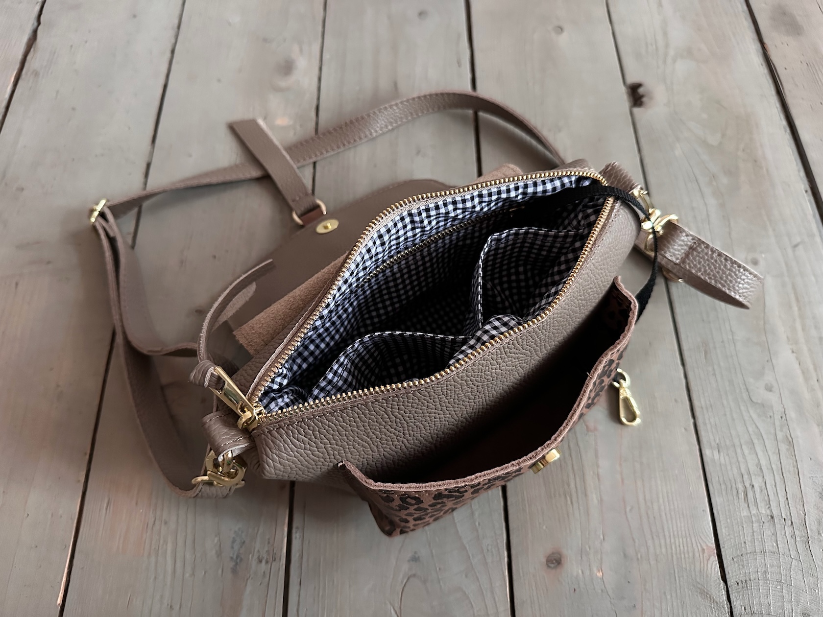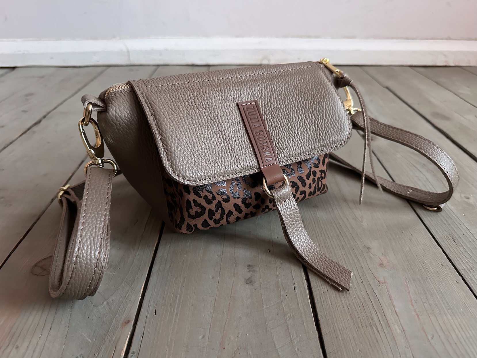 Uszyta ze skóry naturalnej licowej + welurowej + bawełnianej podszewki.