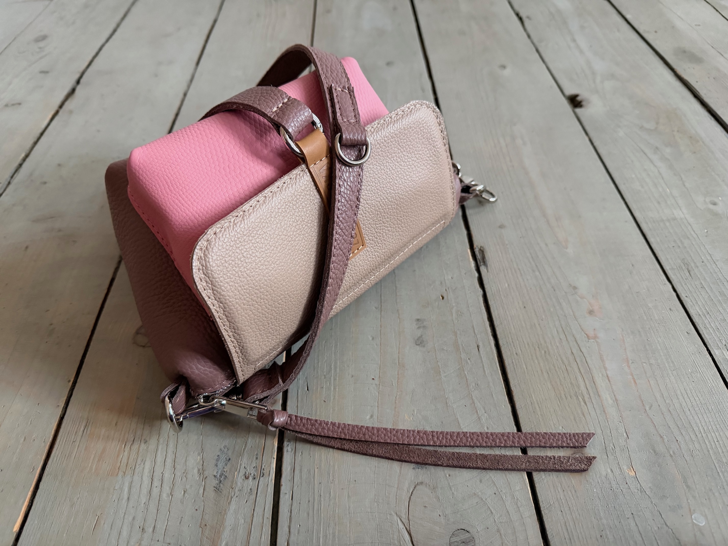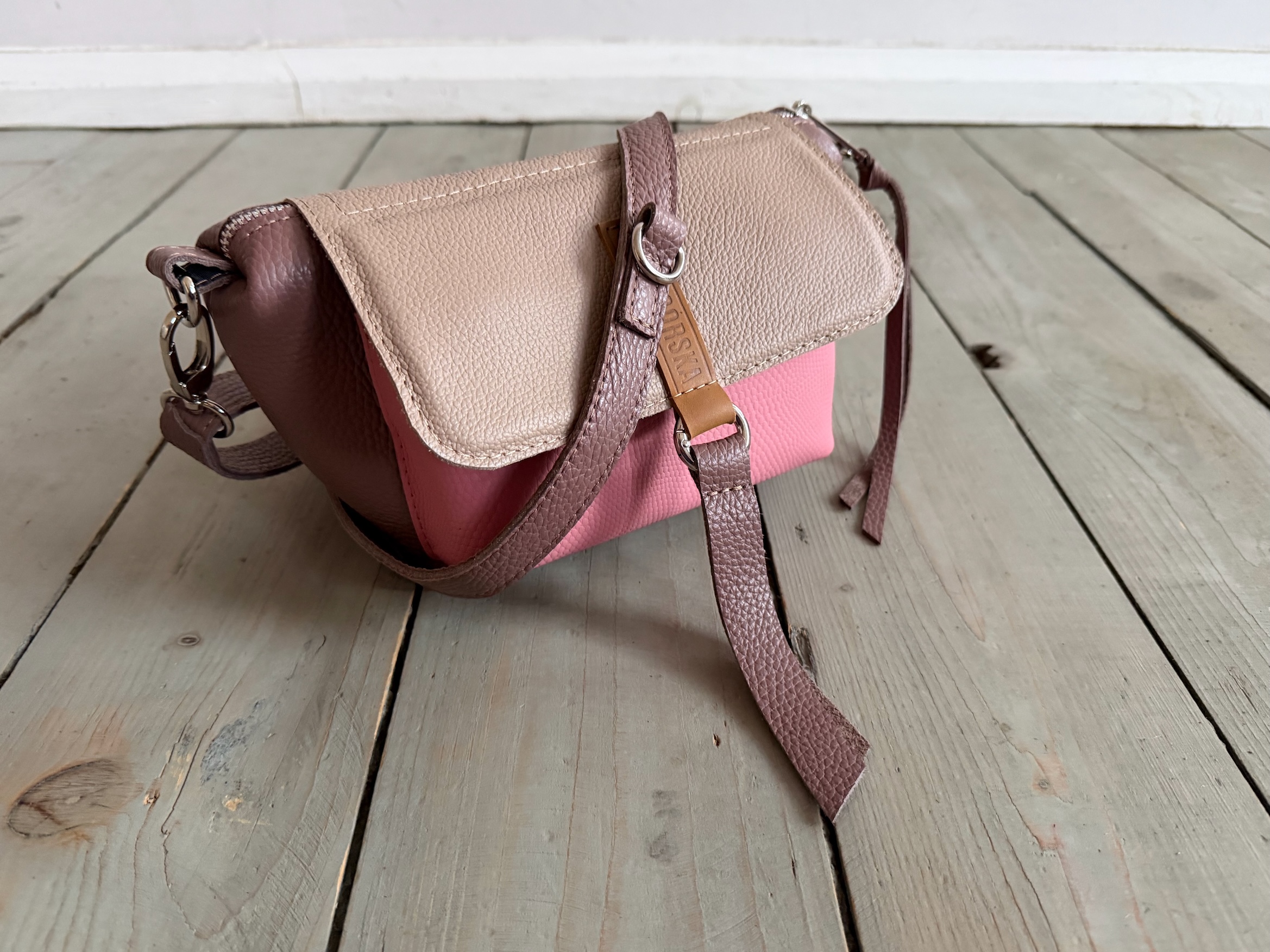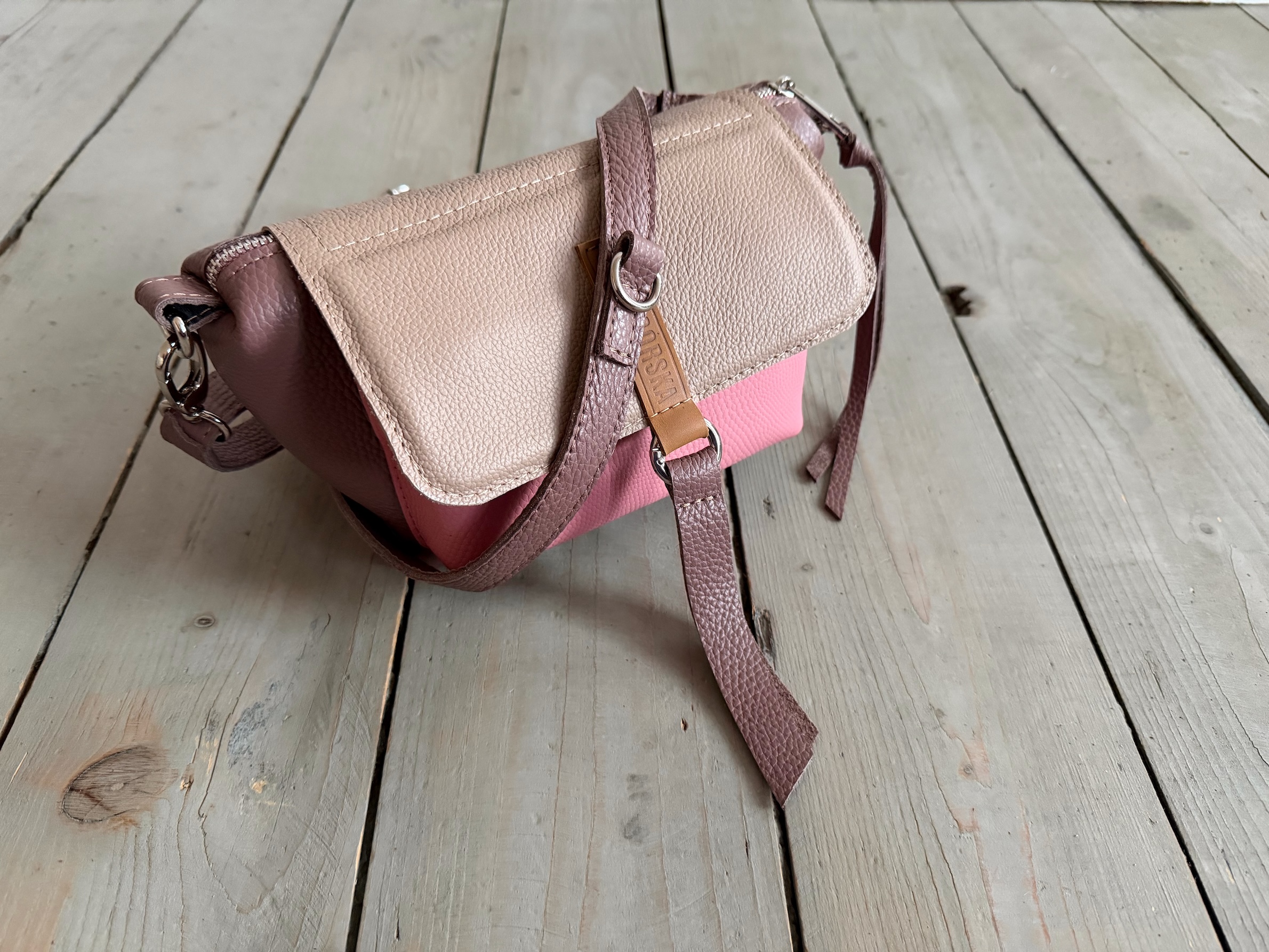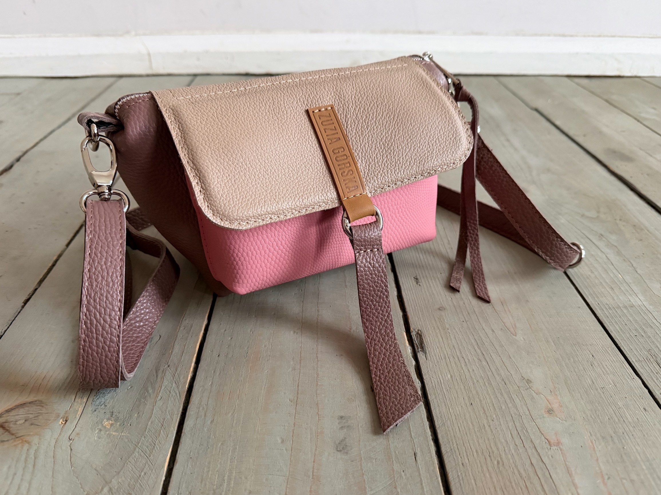 Uszyta ze skóry naturalnej licowej + bawełnianej podszewki.