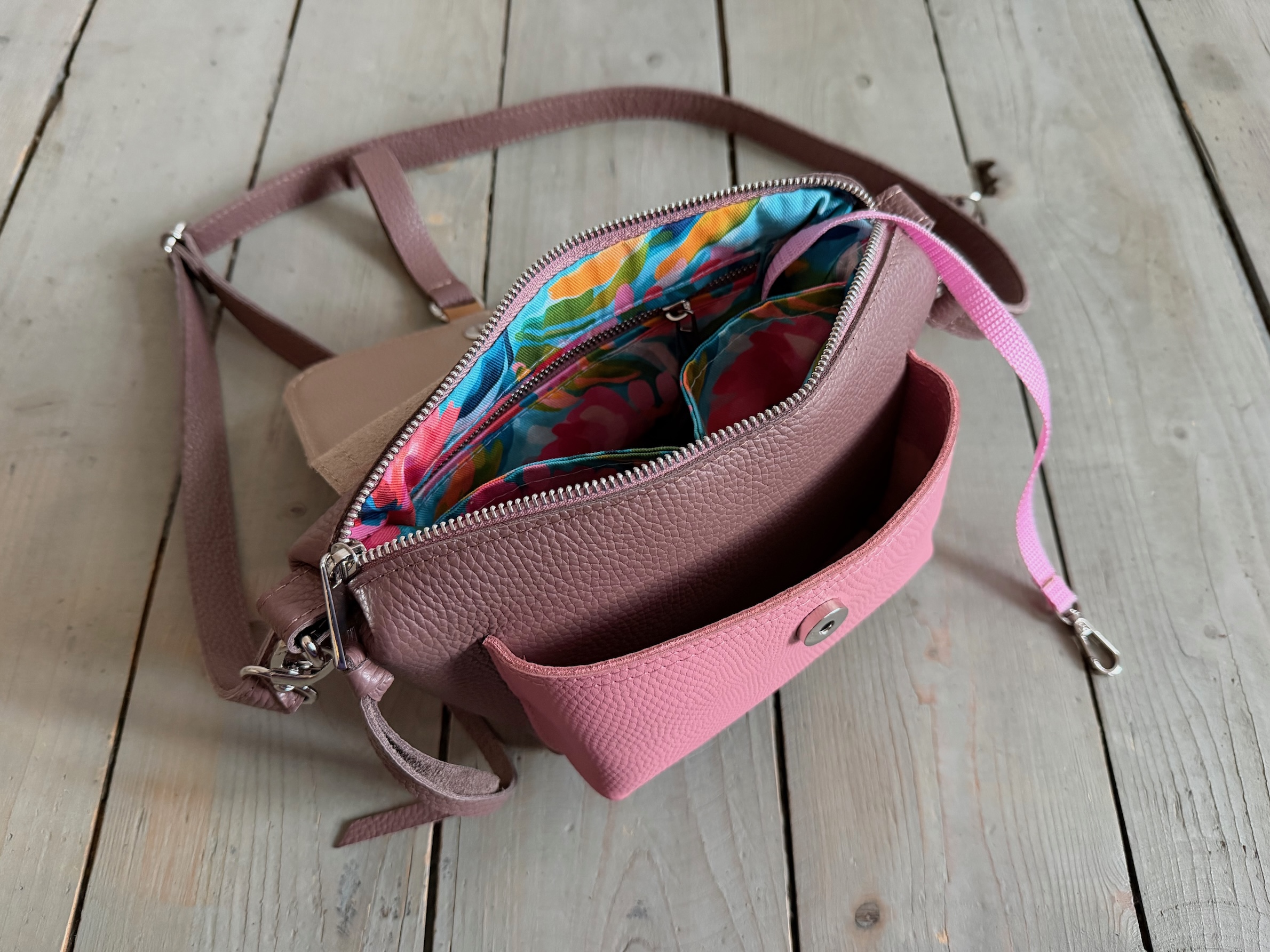 Wewnątrz kieszonka na zamek, dwie kieszonki wsuwki oraz smyczka z karabińczykiem.