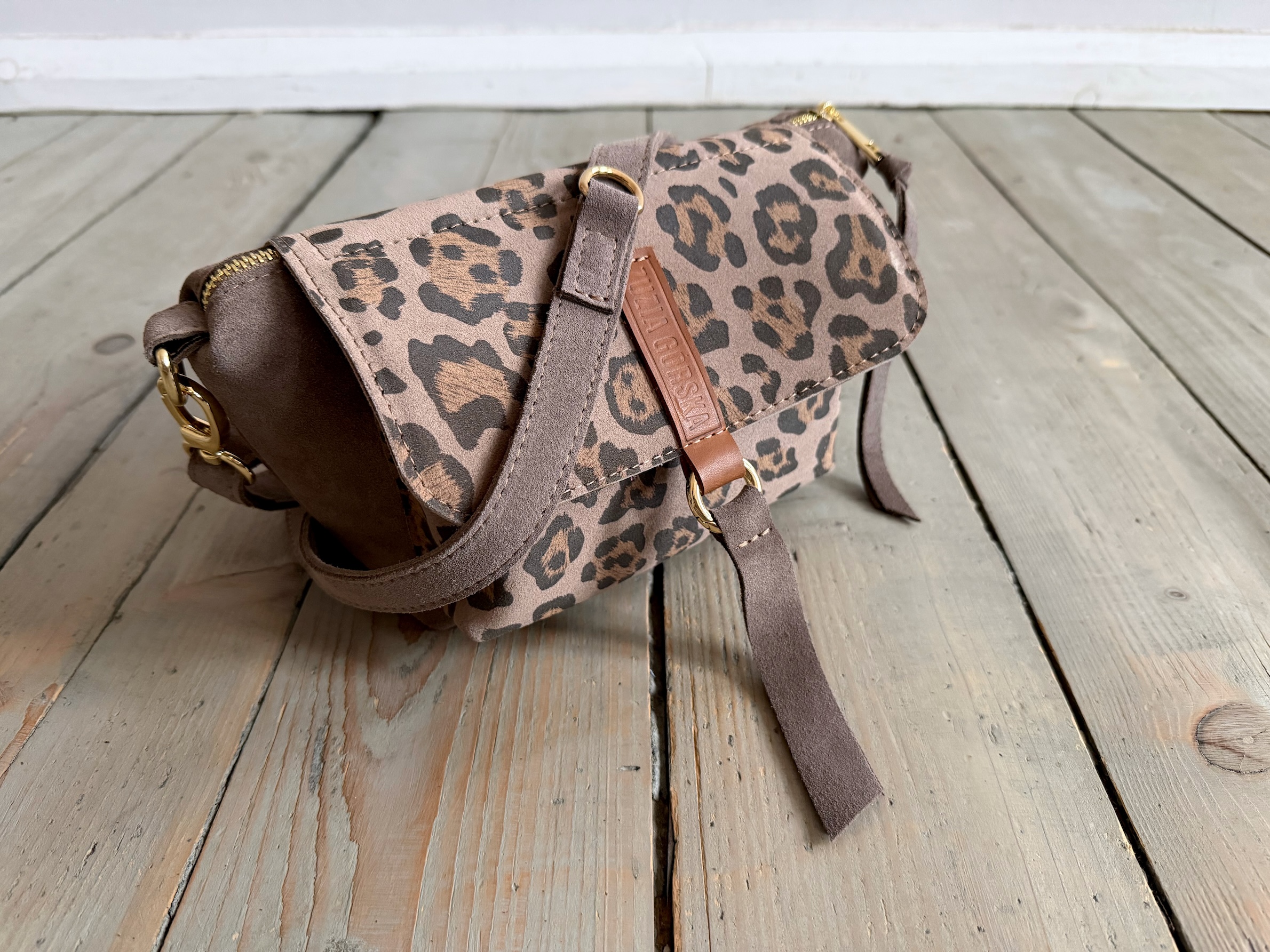 Uszyta ze skóry naturalnej welurowej + nubukowej + bawełnianej podszewki.