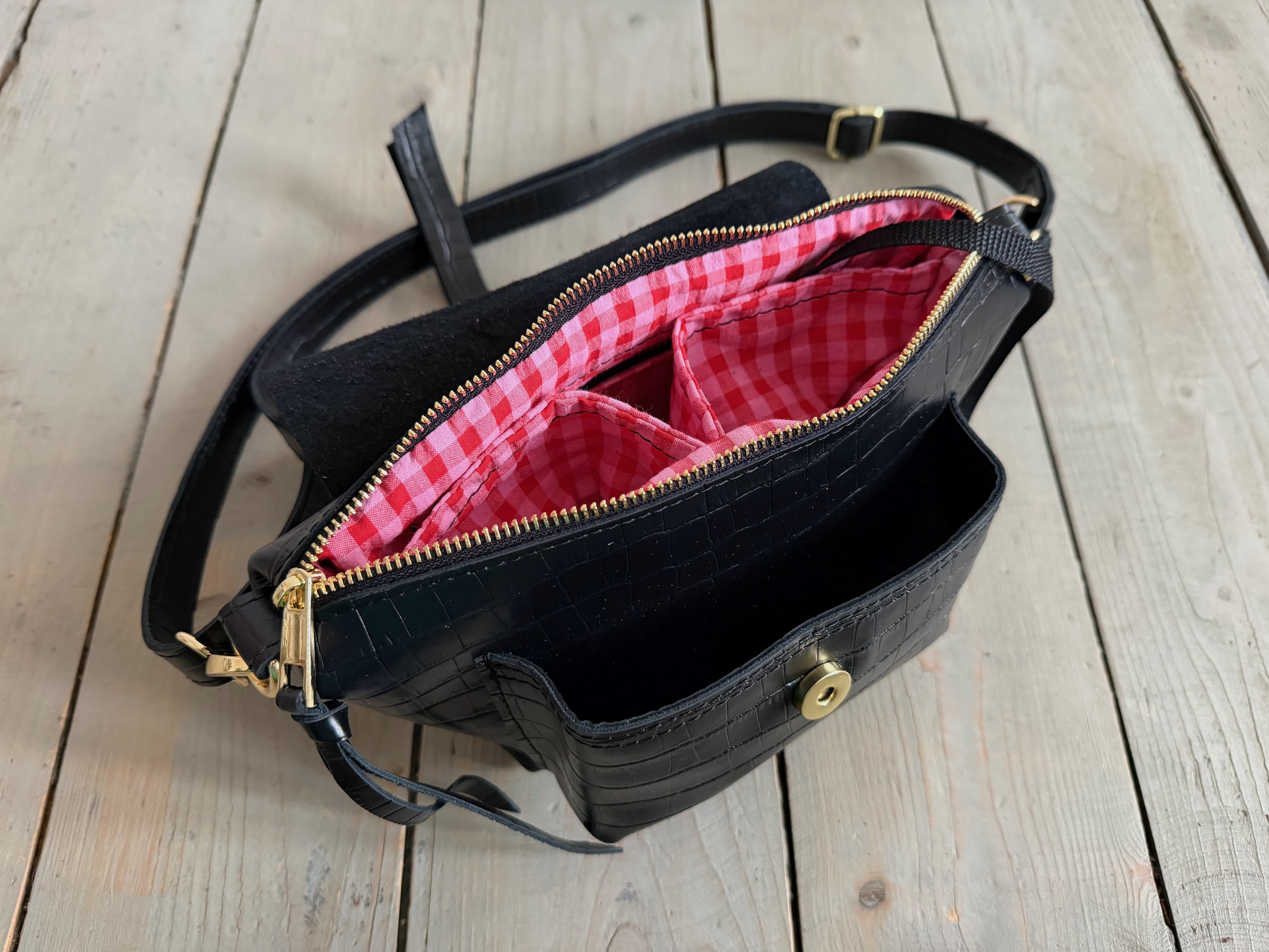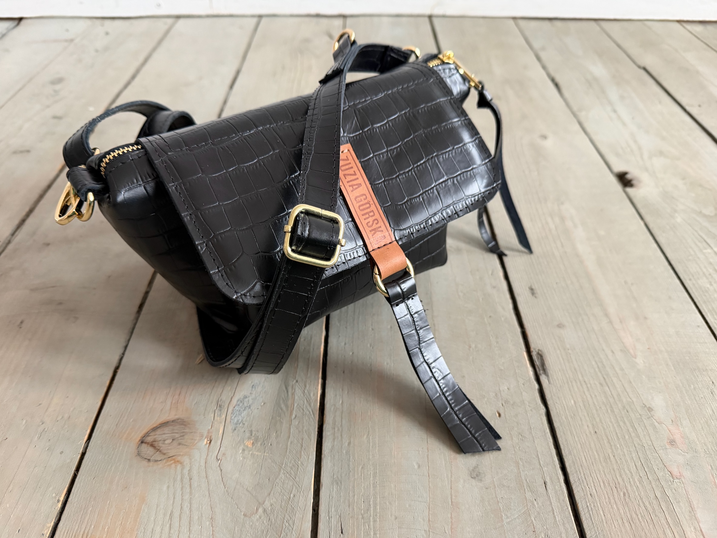 Uszyta ze skóry naturalnej licowej + bawełnianej podszewki.