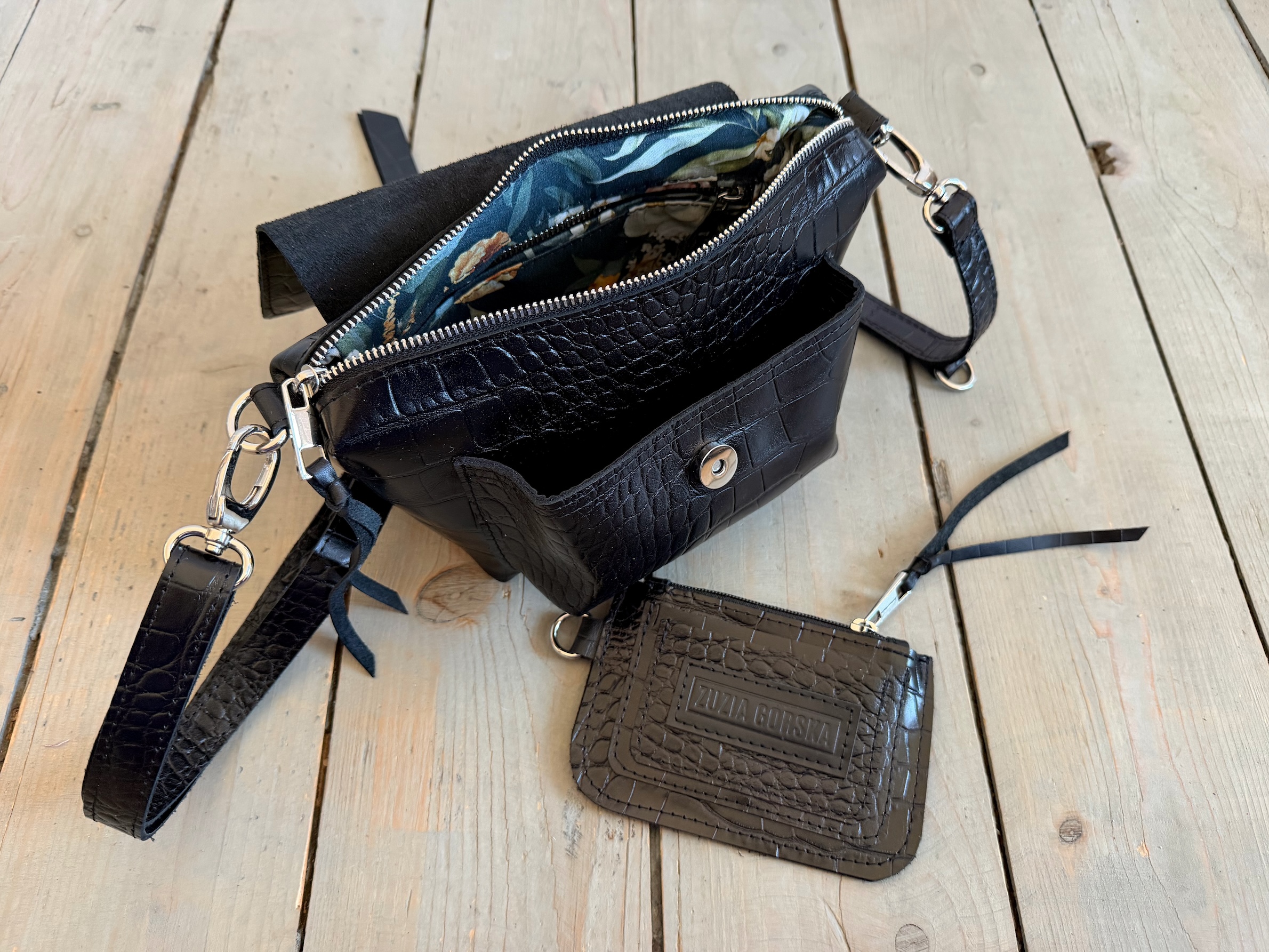 Wewnątrz kieszonka na zamek, dwie kieszonki wsuwki oraz smyczka z karabińczykiem.