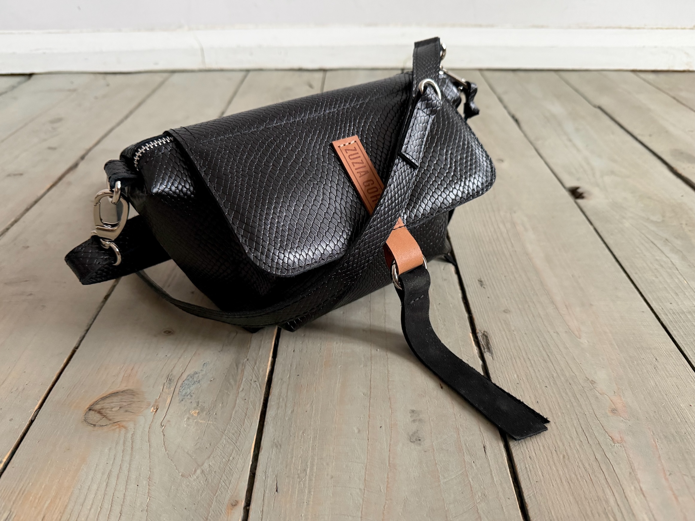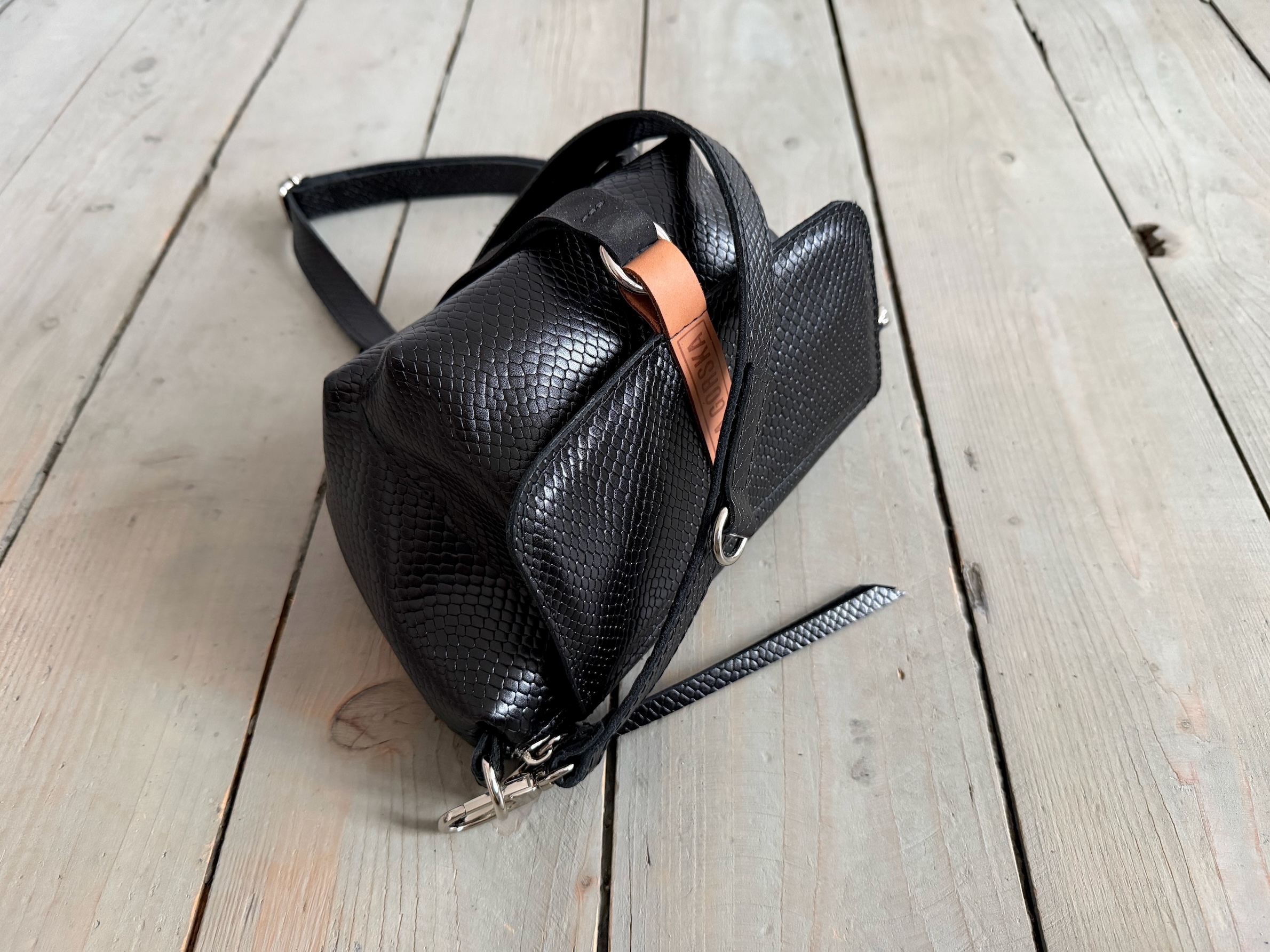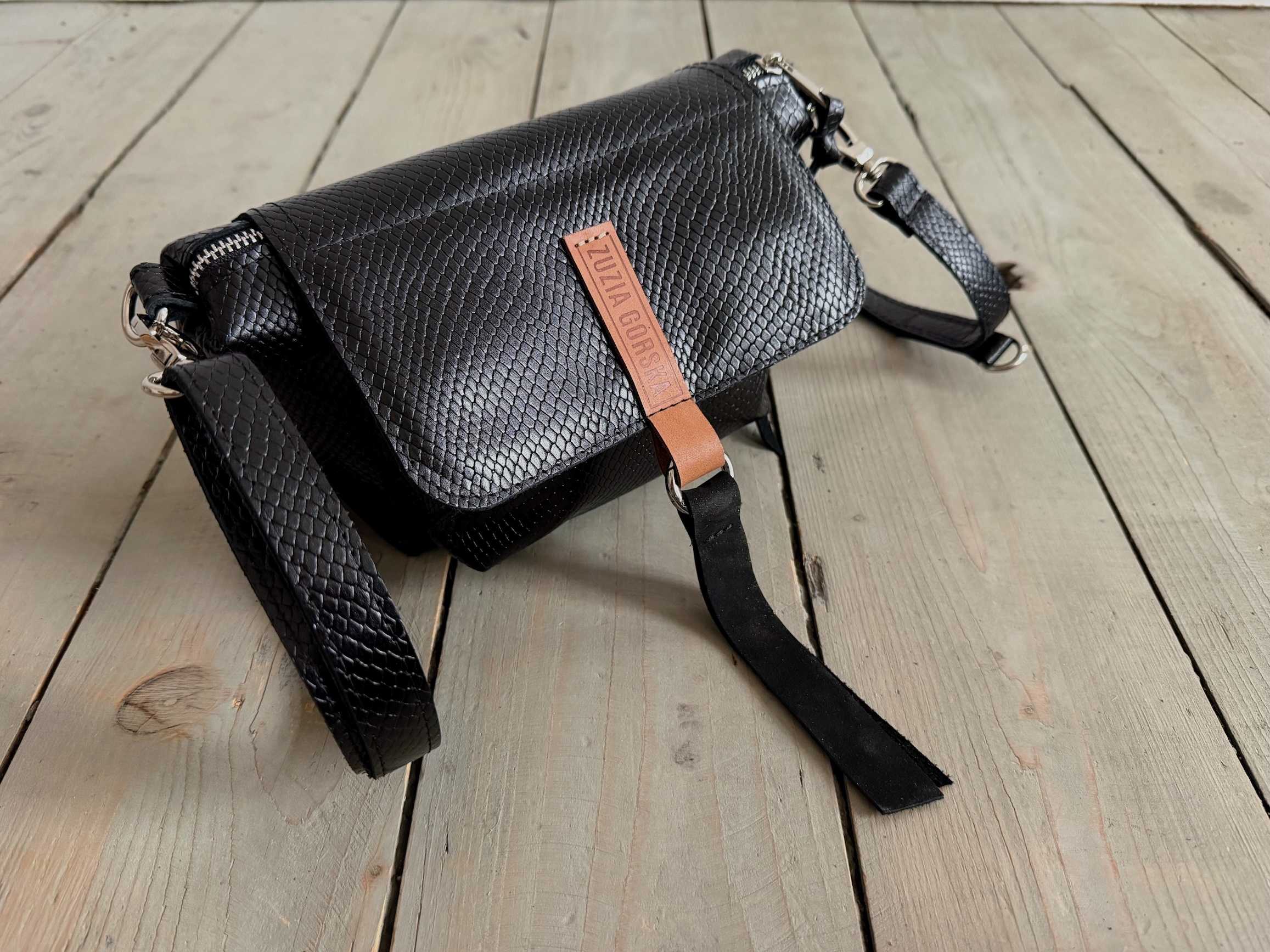 Uszyta ze skóry naturalnej licowej + bawełnianej podszewki.