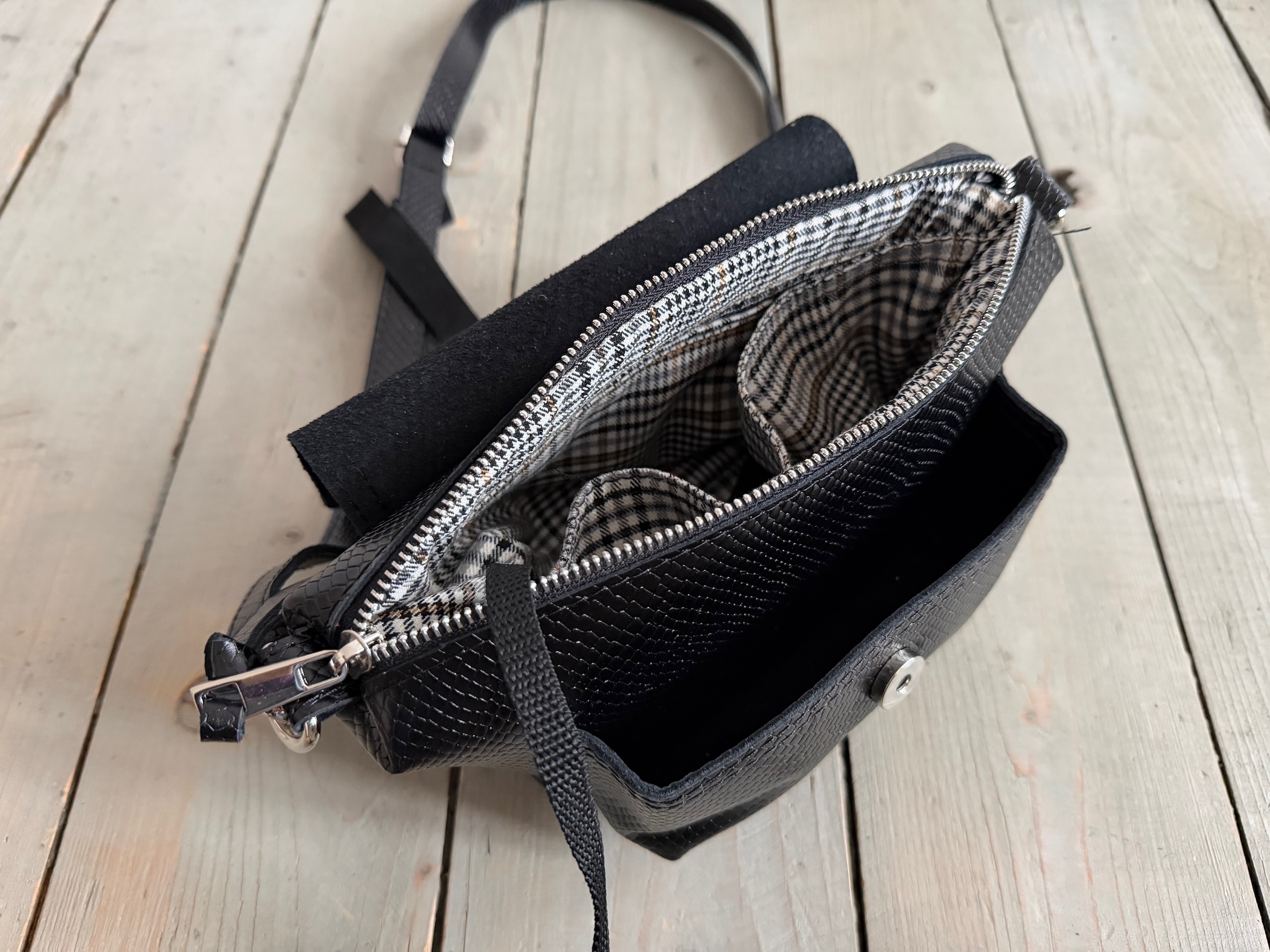 Wewnątrz kieszonka na zamek, dwie kieszonki wsuwki oraz smyczka z karabińczykiem.