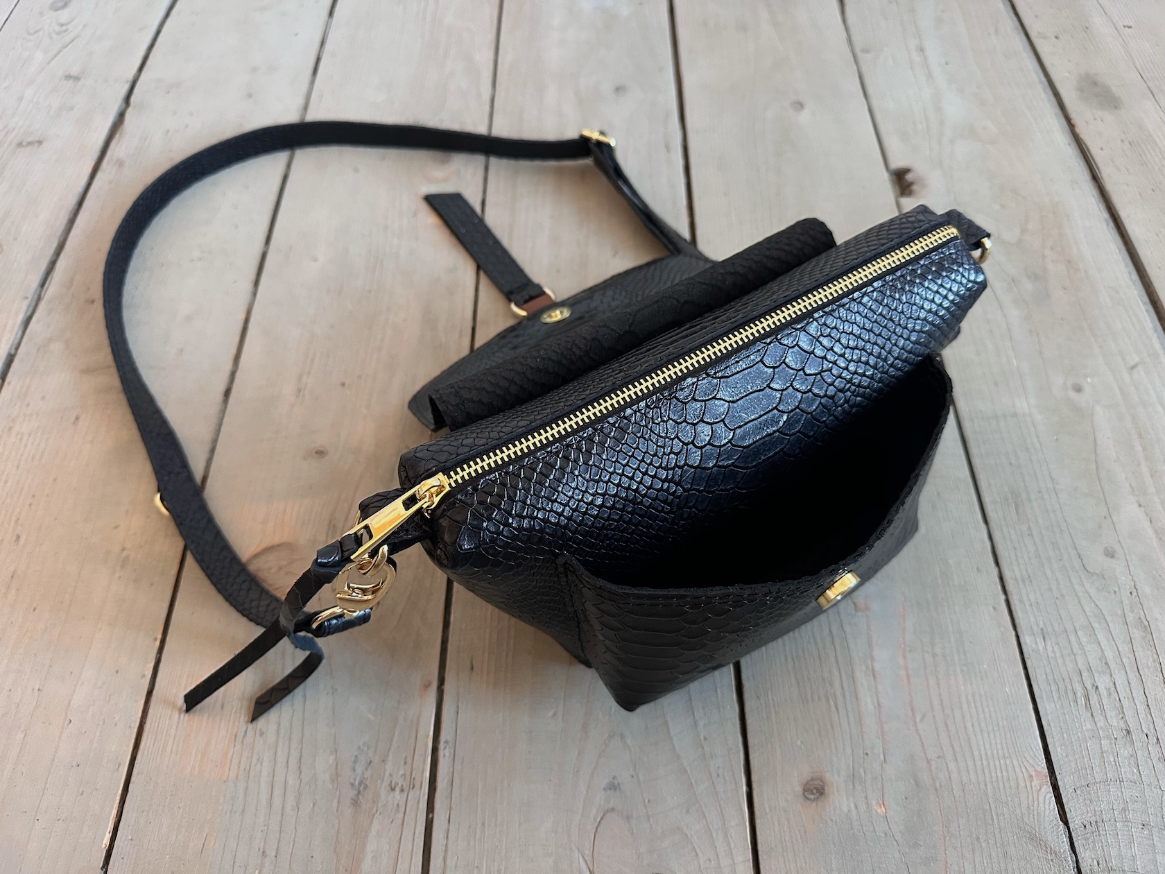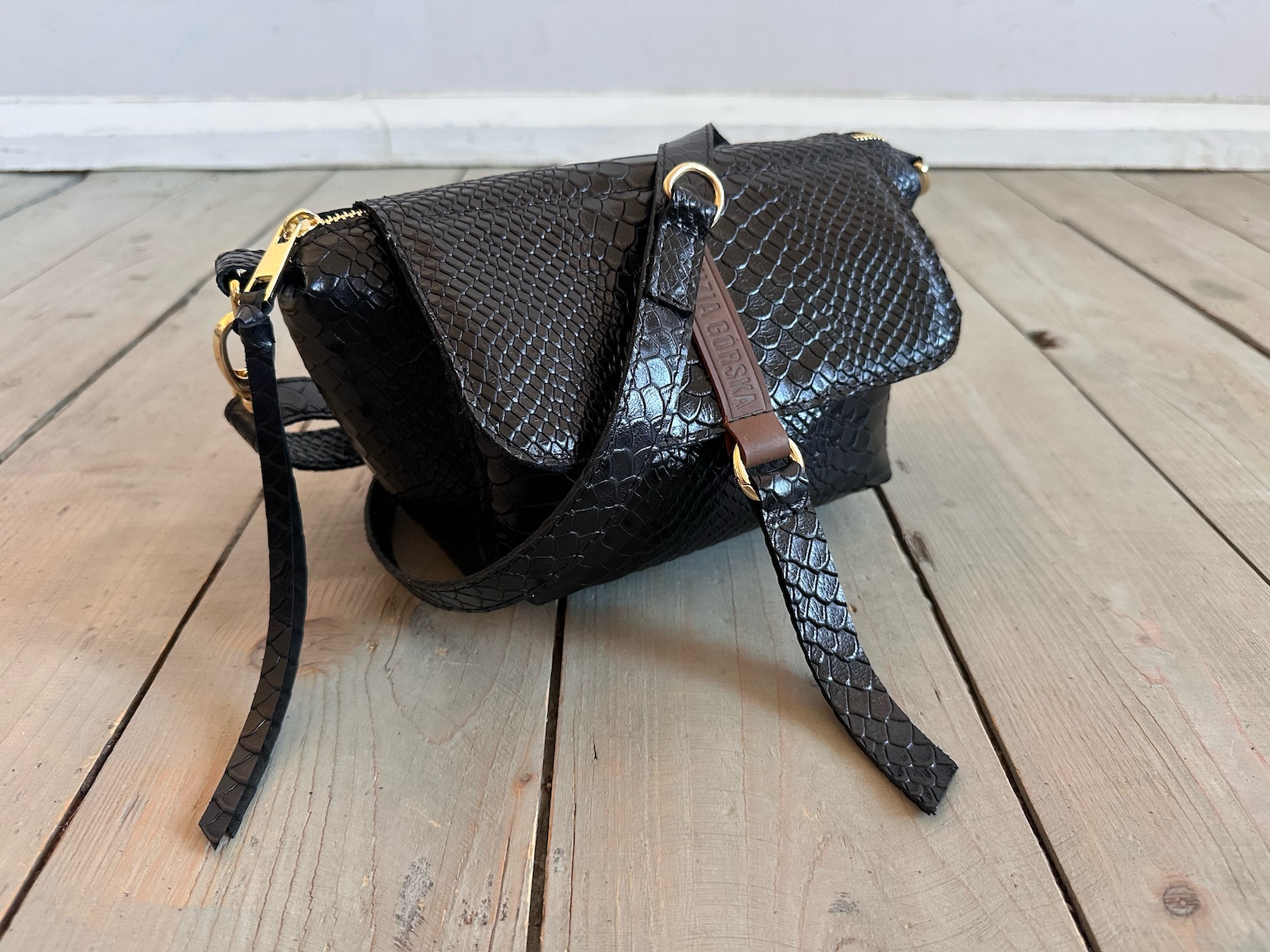 Uszyta ze skóry naturalnej licowej + bawełnianej podszewki.