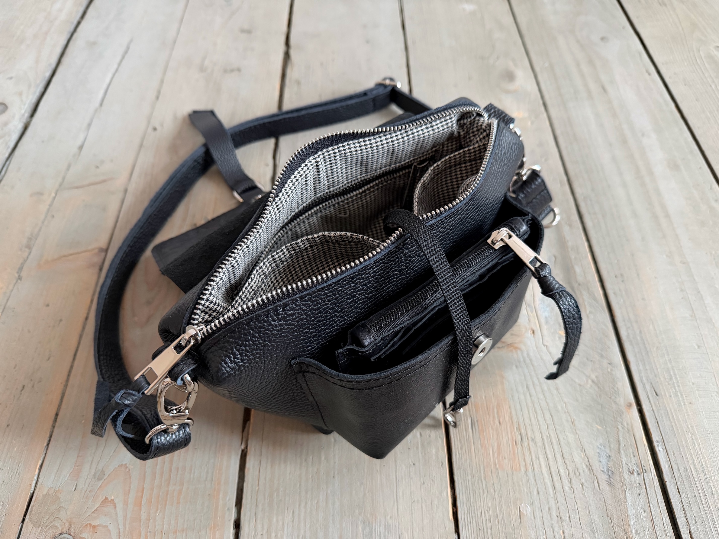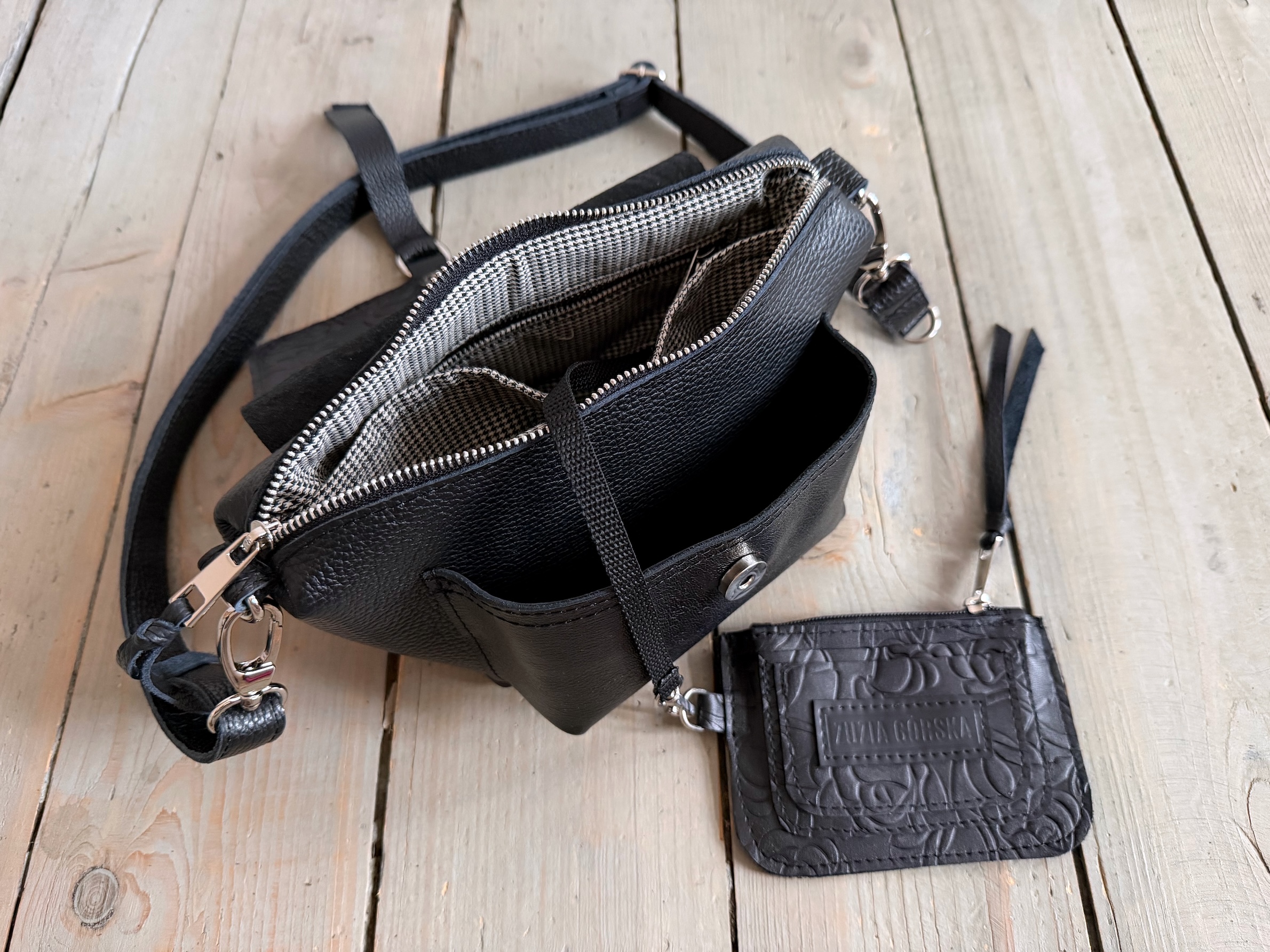 Wewnątrz kieszonka na zamek, dwie kieszonki wsuwki oraz smyczka z karabińczykiem.