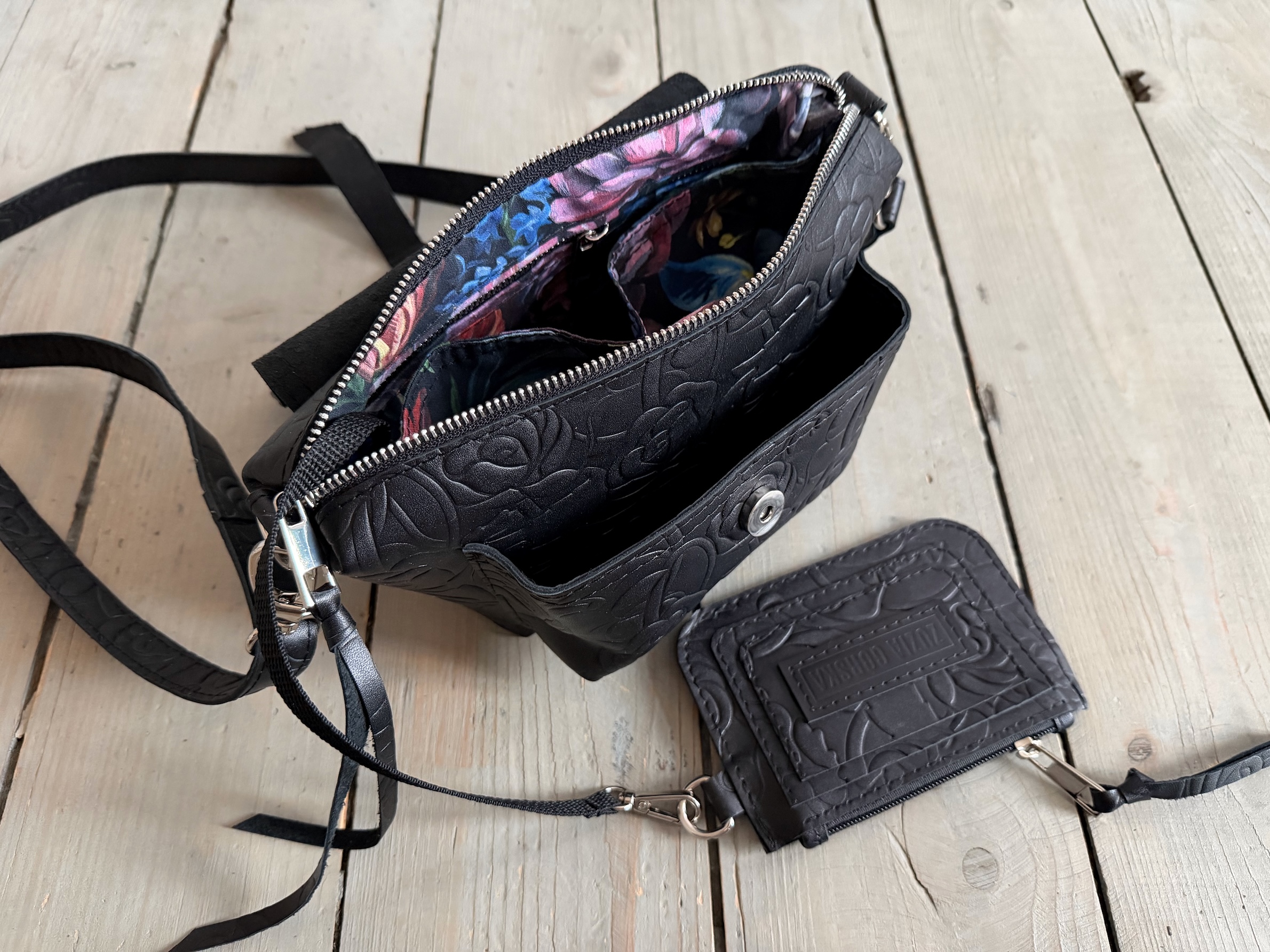Wewnątrz kieszonka na zamek, dwie kieszonki wsuwki oraz smyczka z karabińczykiem.