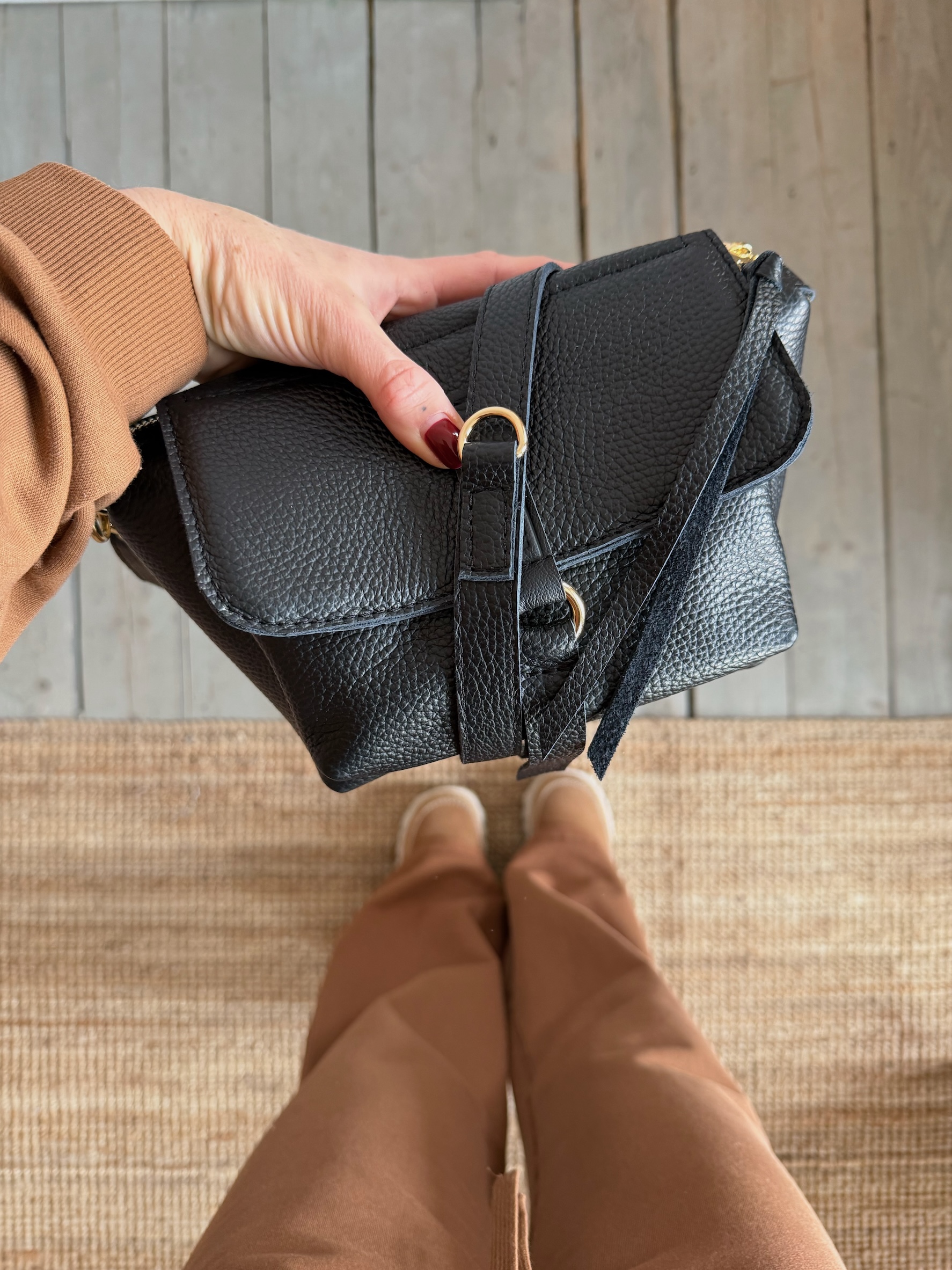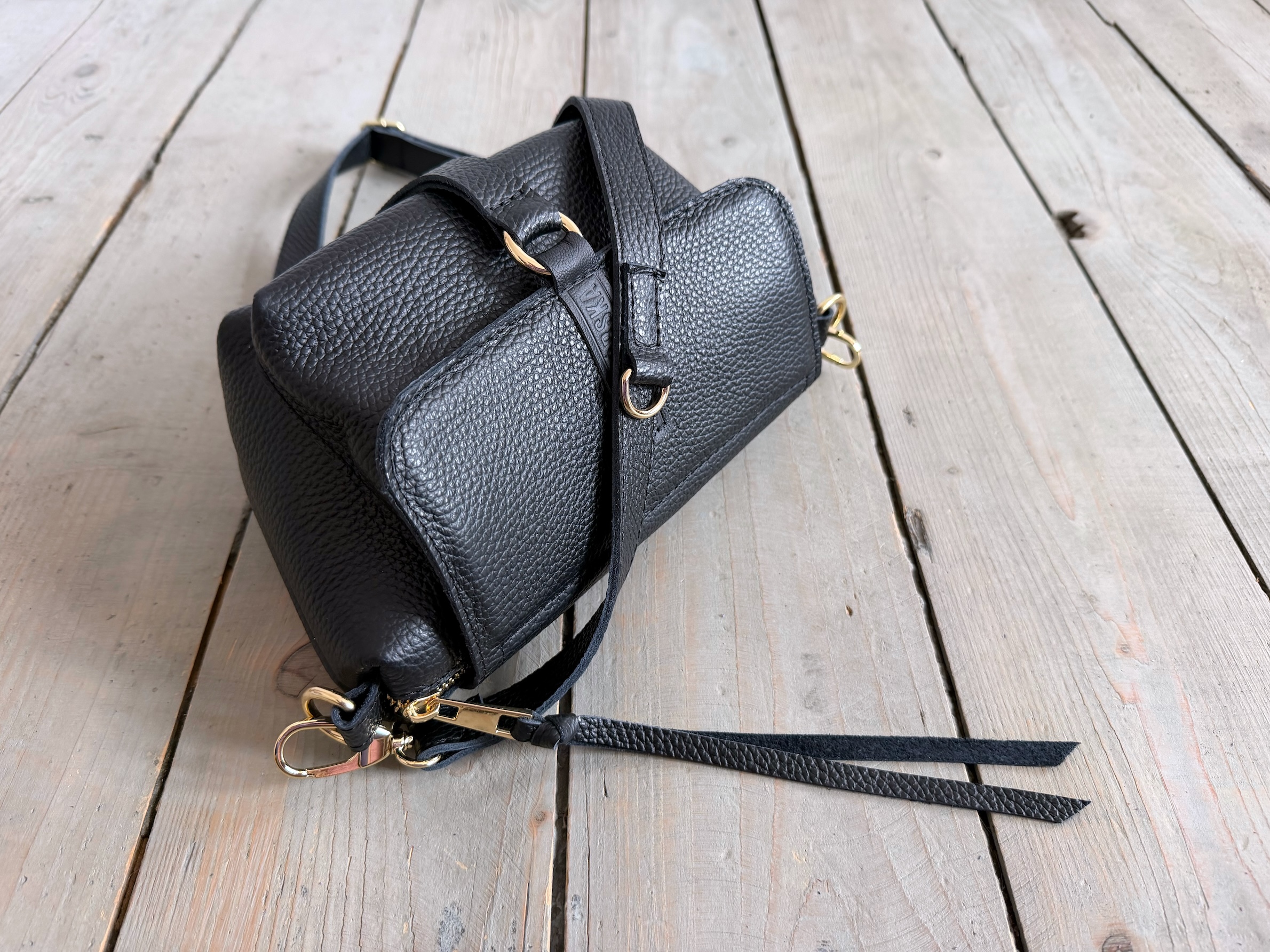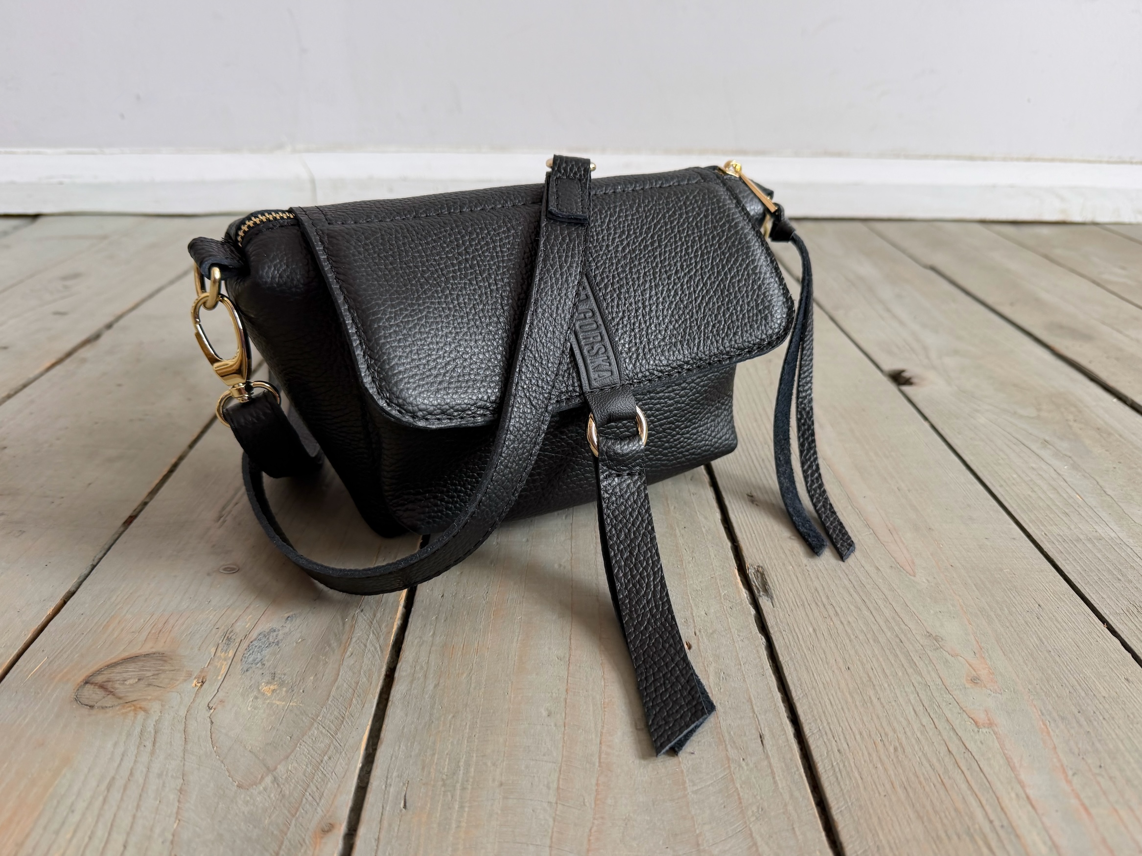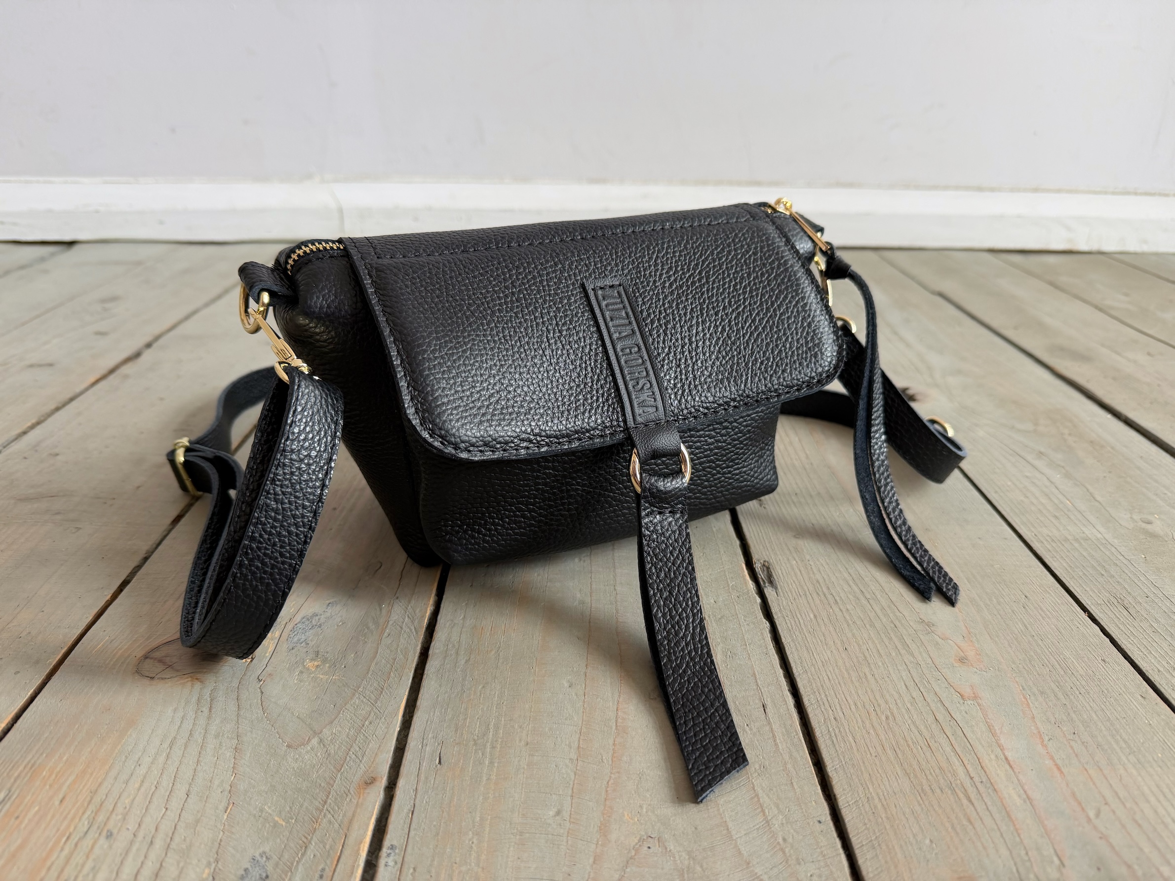 Uszyta ze skóry naturalnej licowej + bawełnianej podszewki.