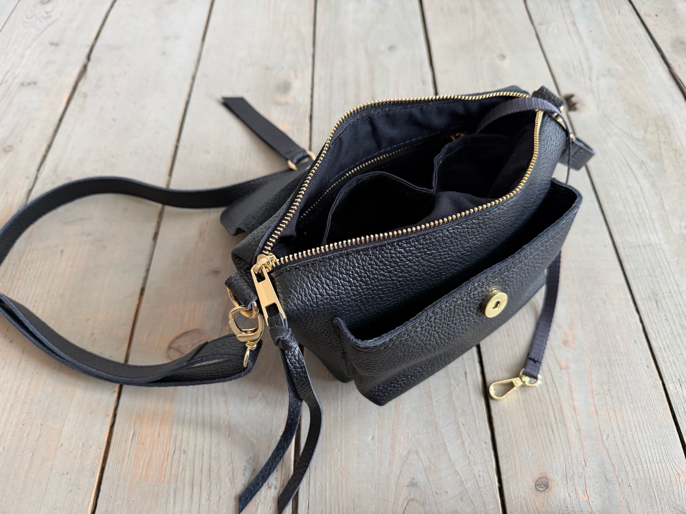 Wewnątrz kieszonka na zamek, dwie kieszonki wsuwki oraz smyczka z karabińczykiem.