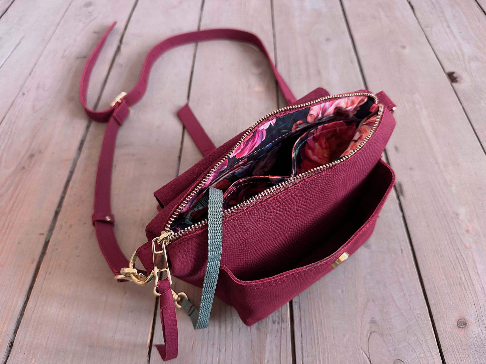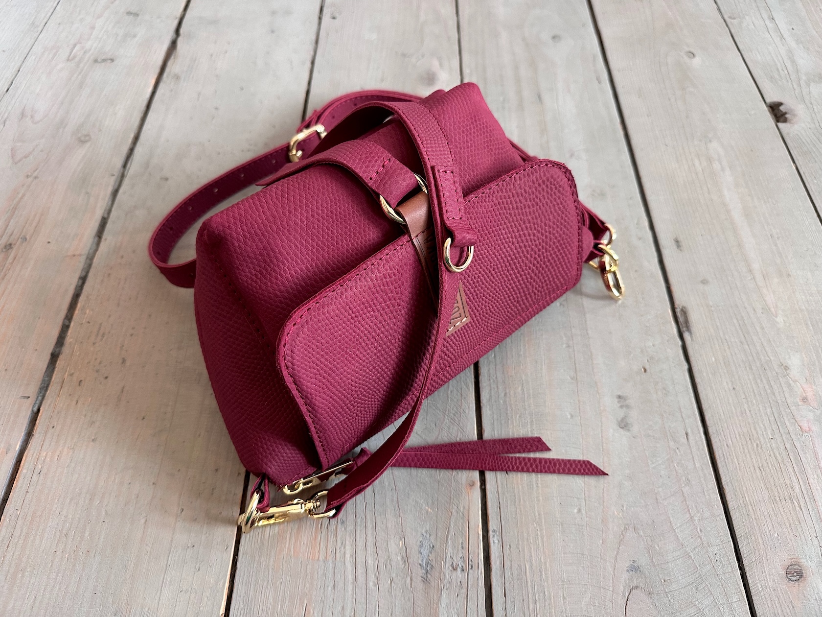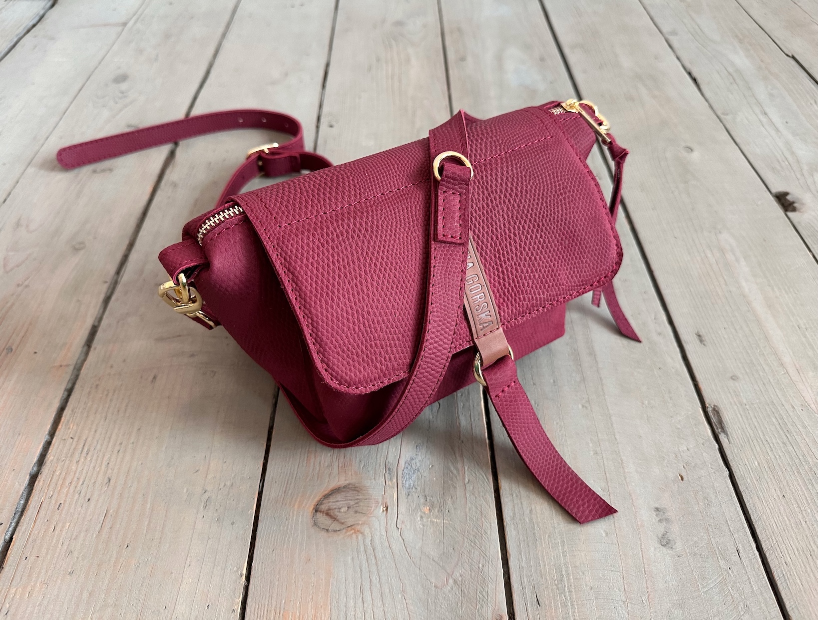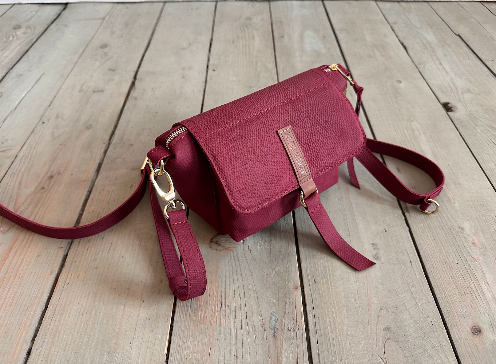 Uszyta ze skóry naturalnej licowej + bawełnianej podszewki.
