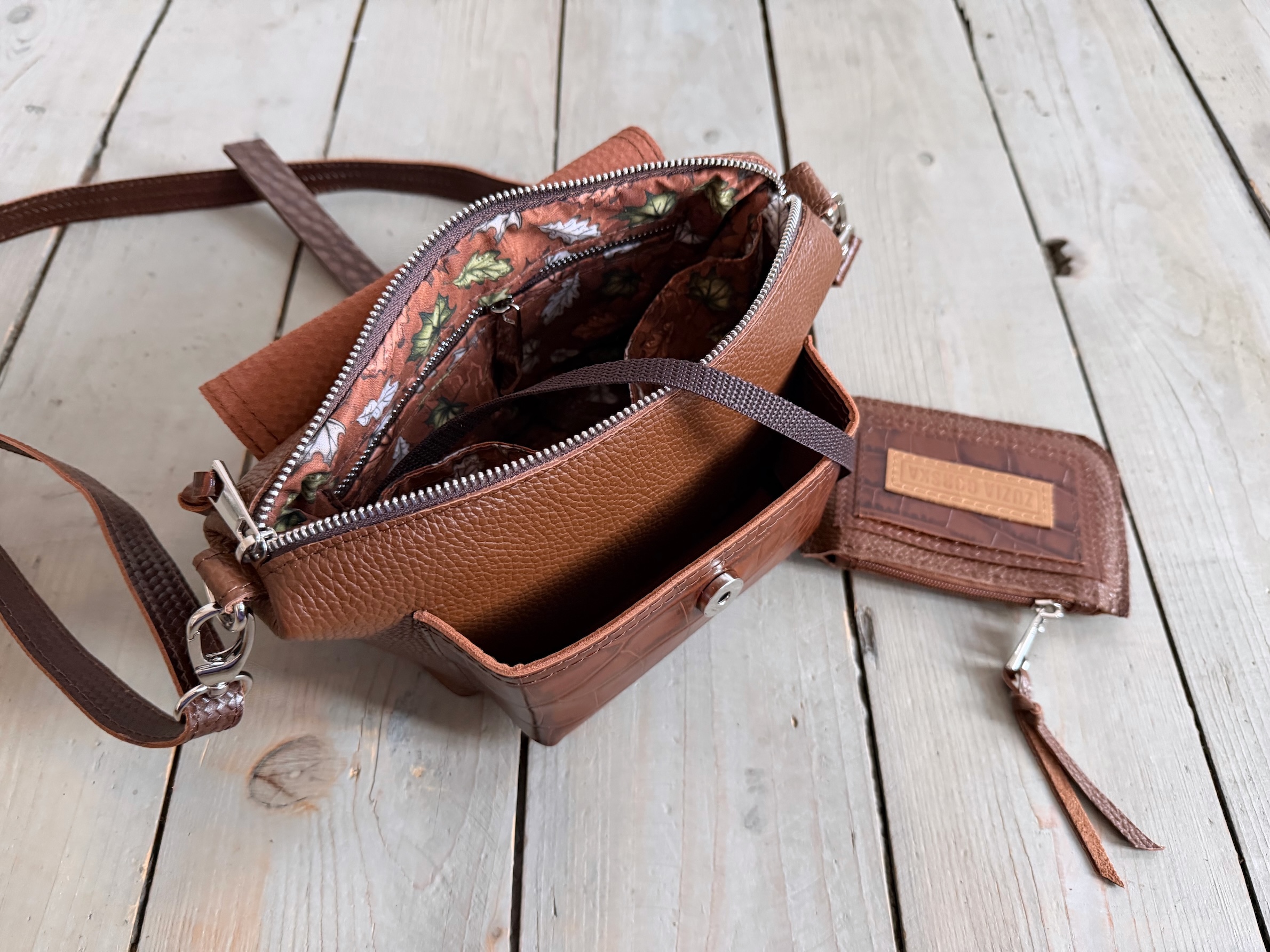 Wewnątrz kieszonka na zamek, dwie kieszonki wsuwki oraz smyczka z karabińczykiem.