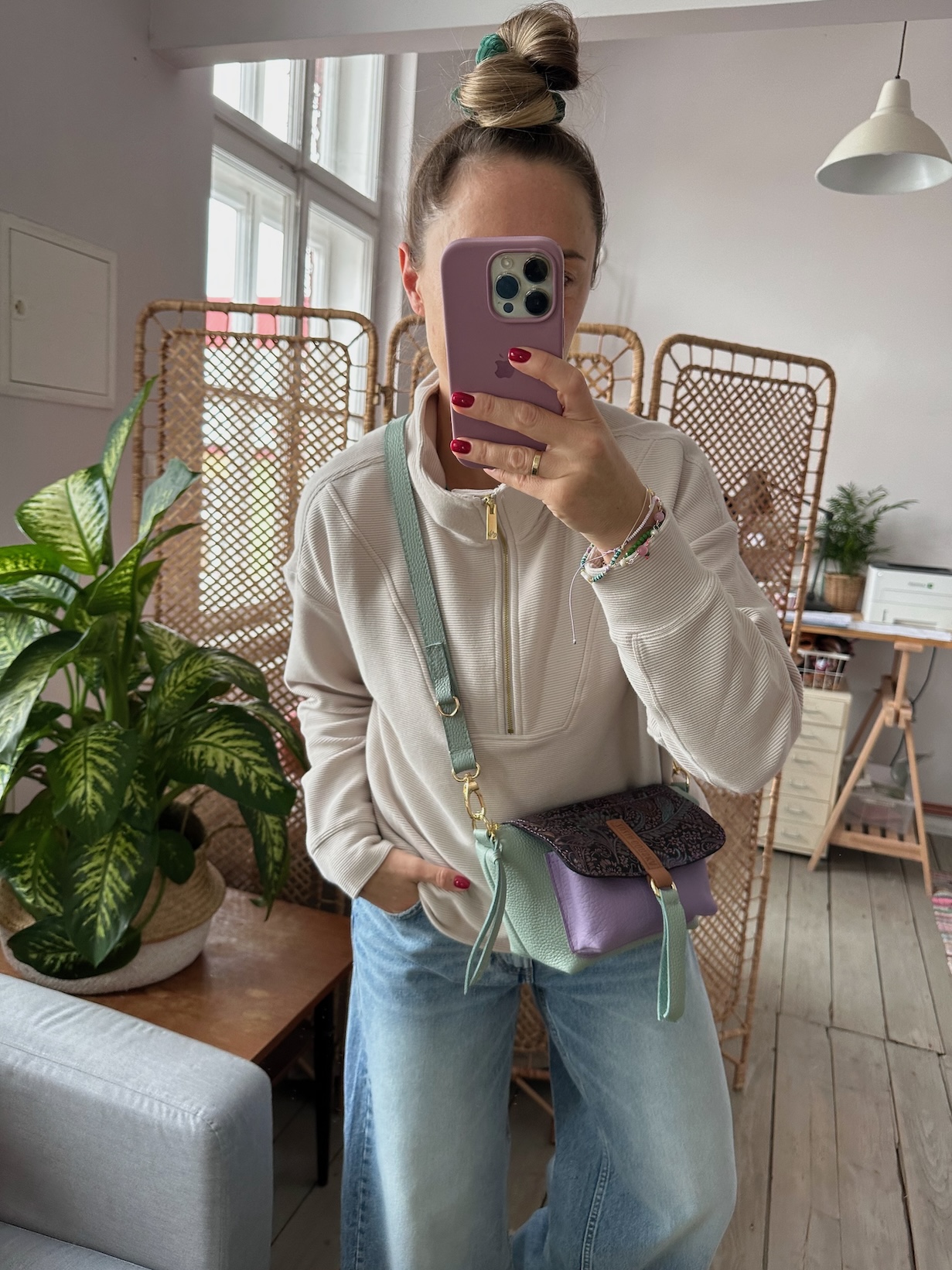 Na zewnątrz naszyta kieszonka idealna na telefon, zamykana na magnes.