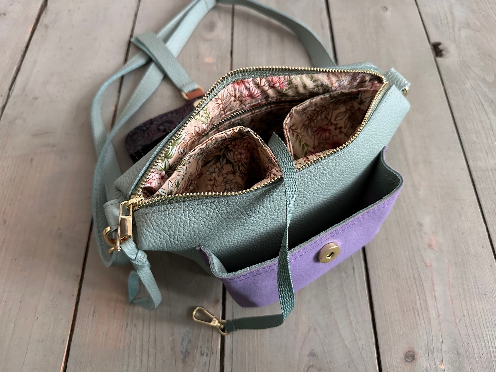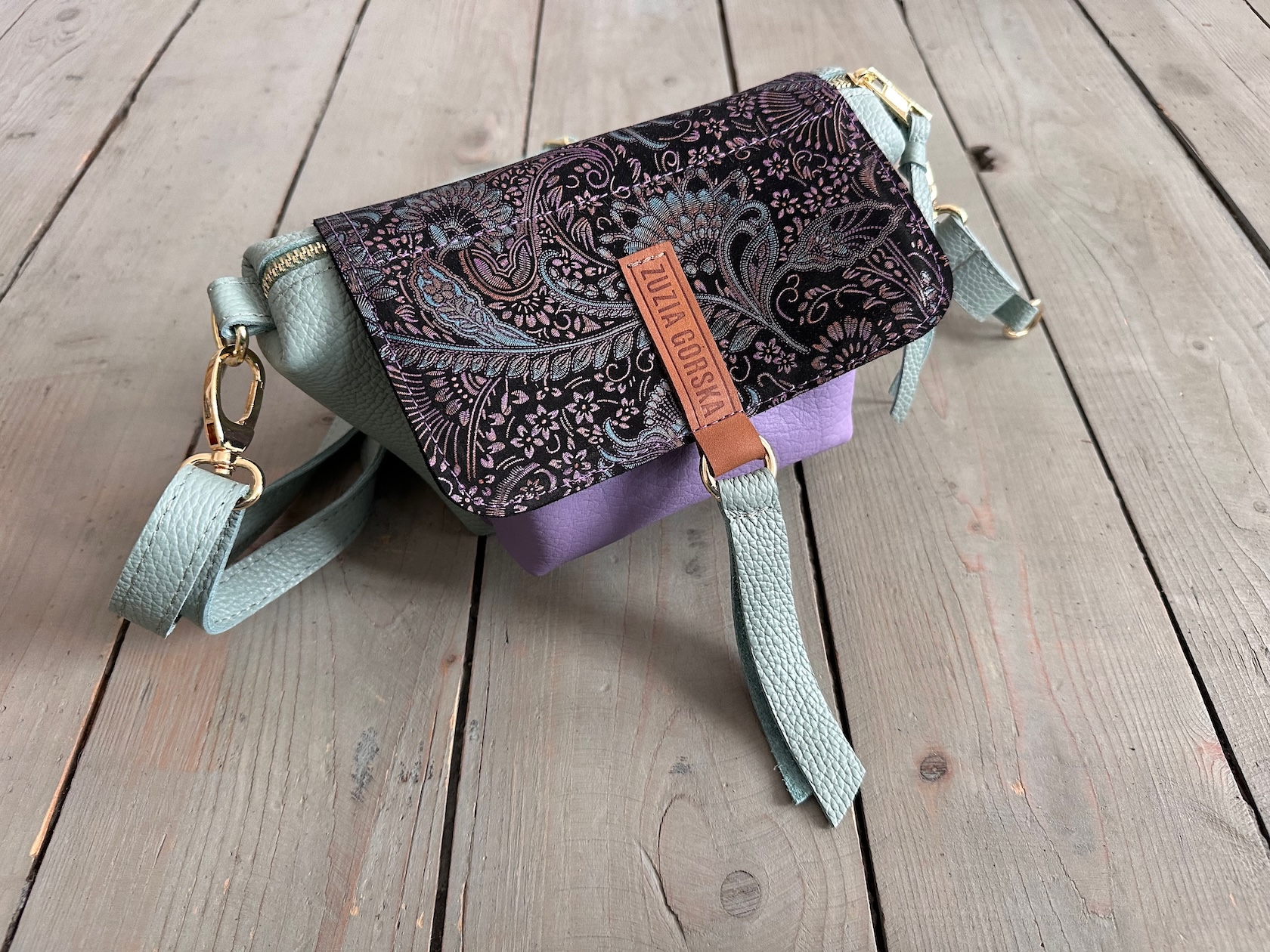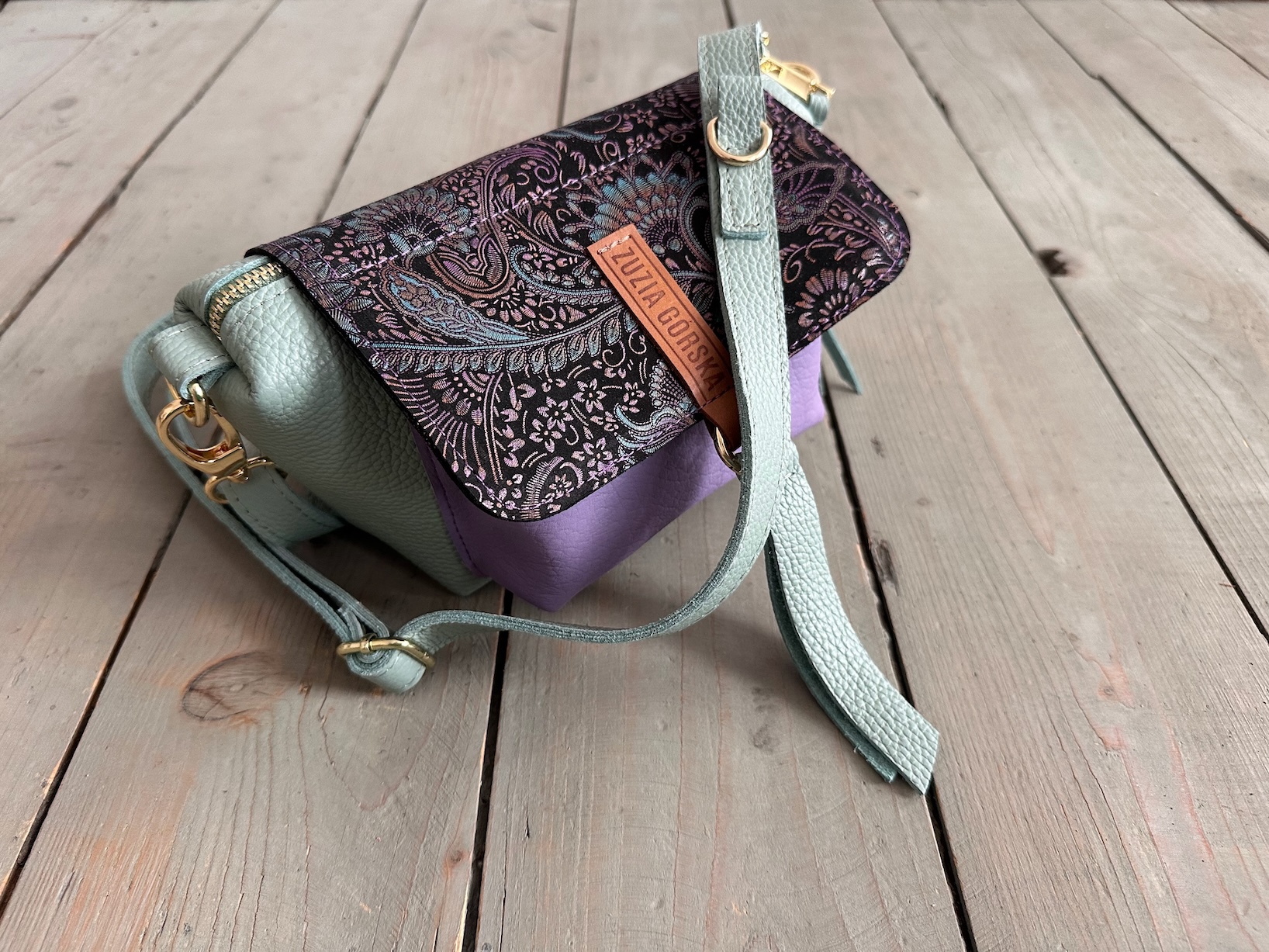 Uszyta ze skóry naturalnej licowej + nubukowej + bawełnianej podszewki.