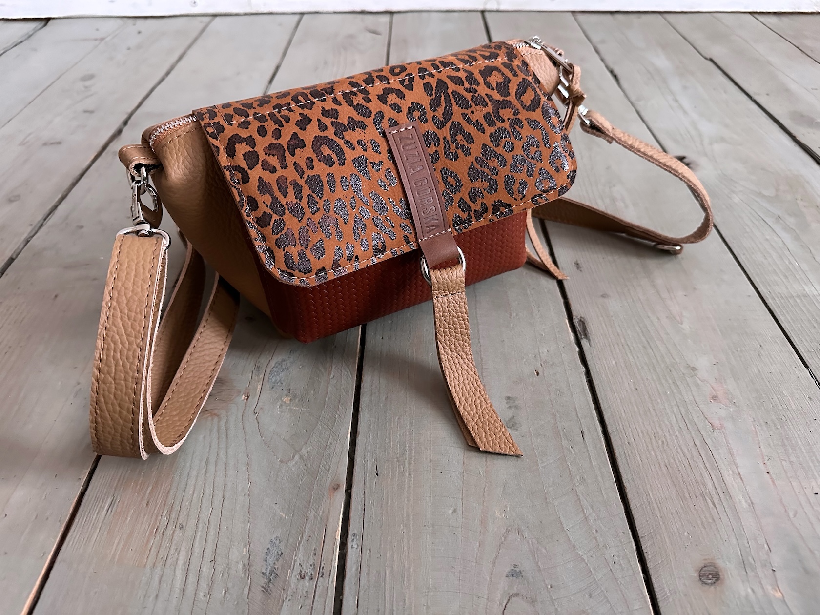 Uszyta ze skóry naturalnej licowej + nubukowej + bawełnianej podszewki.