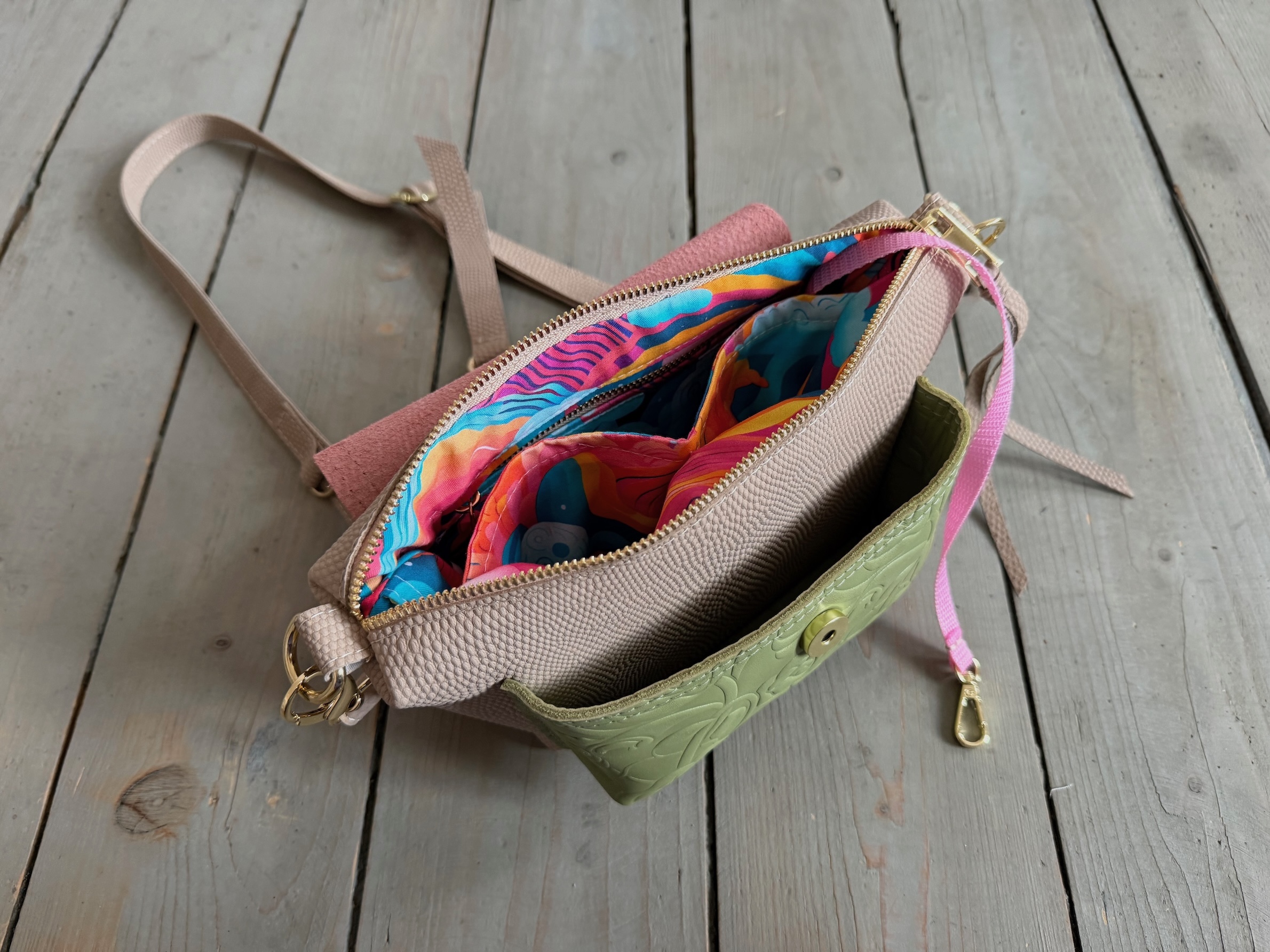 Wewnątrz kieszonka na zamek, dwie kieszonki wsuwki oraz smyczka z karabińczykiem.